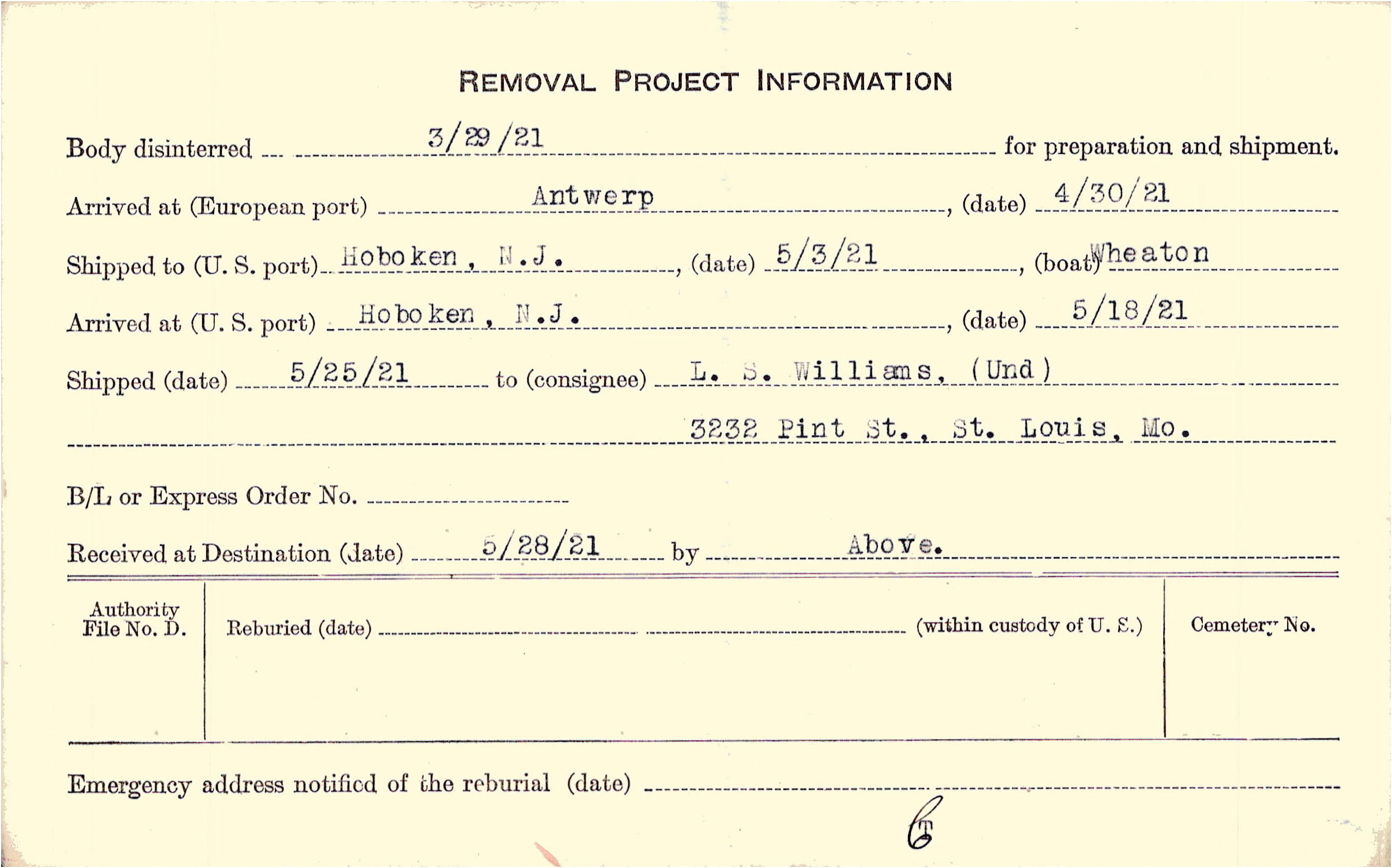 Body disinterred 3/29/1921 for preparation and shipment.