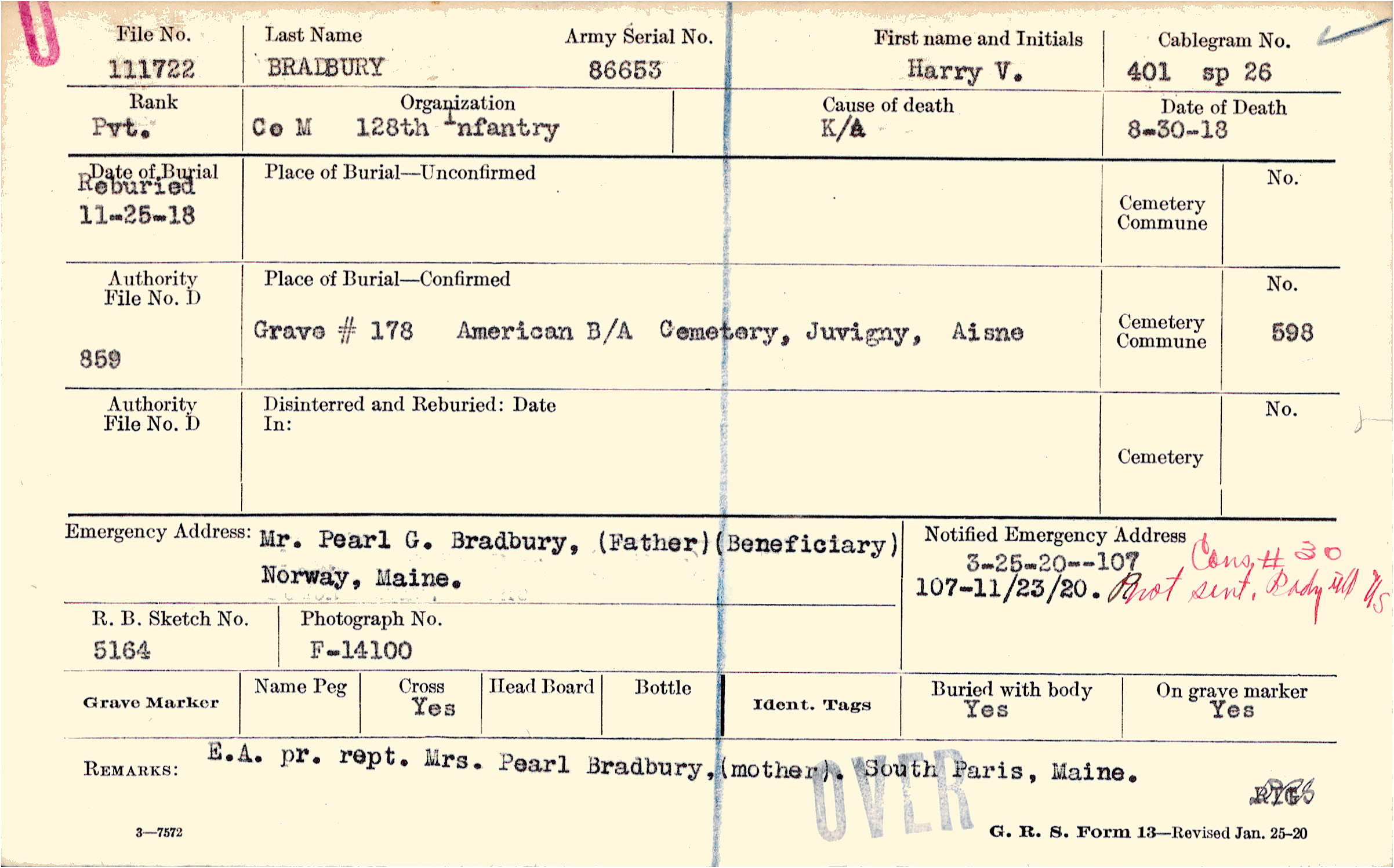 Mr. Pearl G. Bradbury, (Father), Norway, Maine., (Beneficiary) Cons. # 30 not set. [unclear] [unclear] US