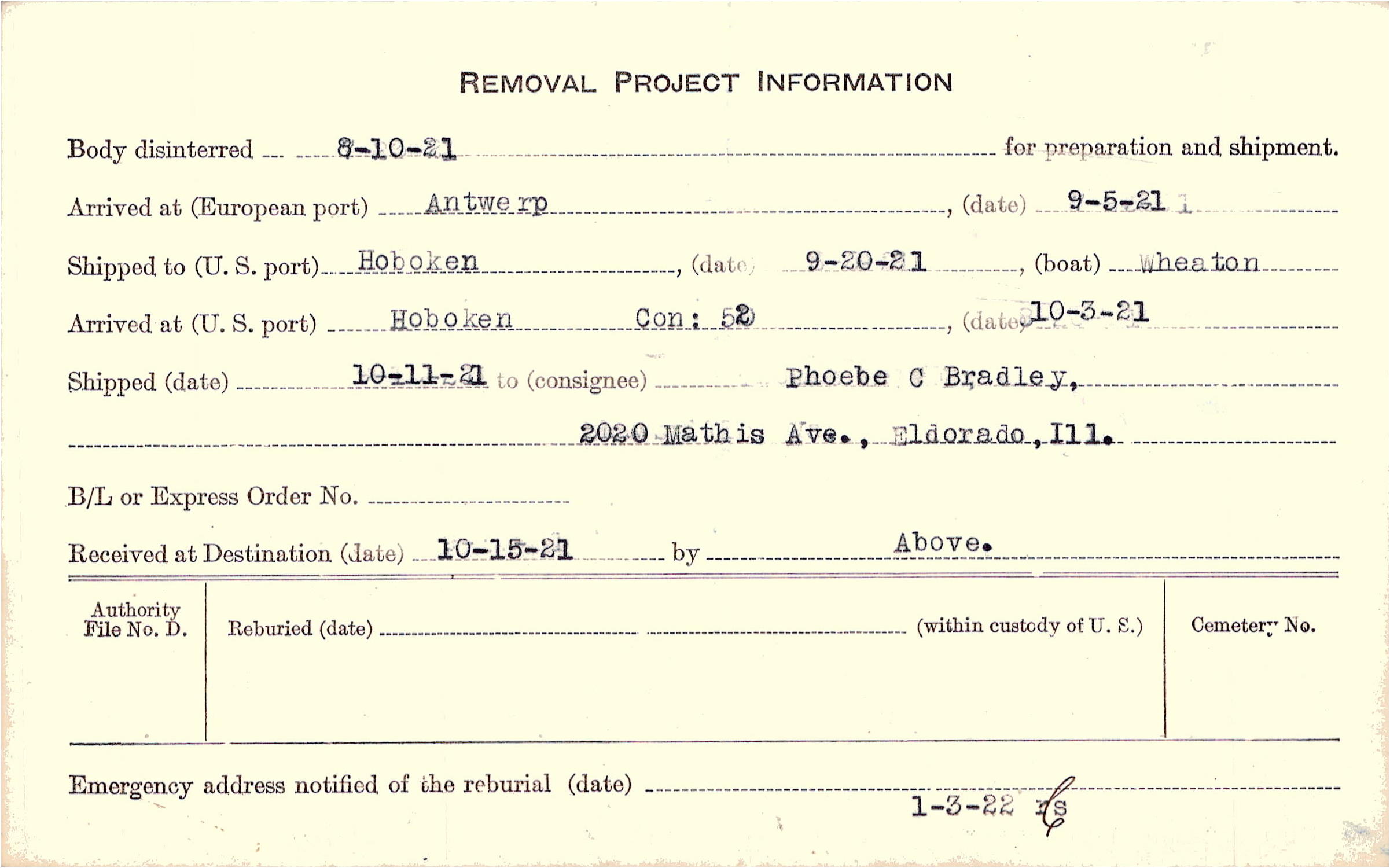 Body disinterred 8/10/1921 for preparation and shipment.