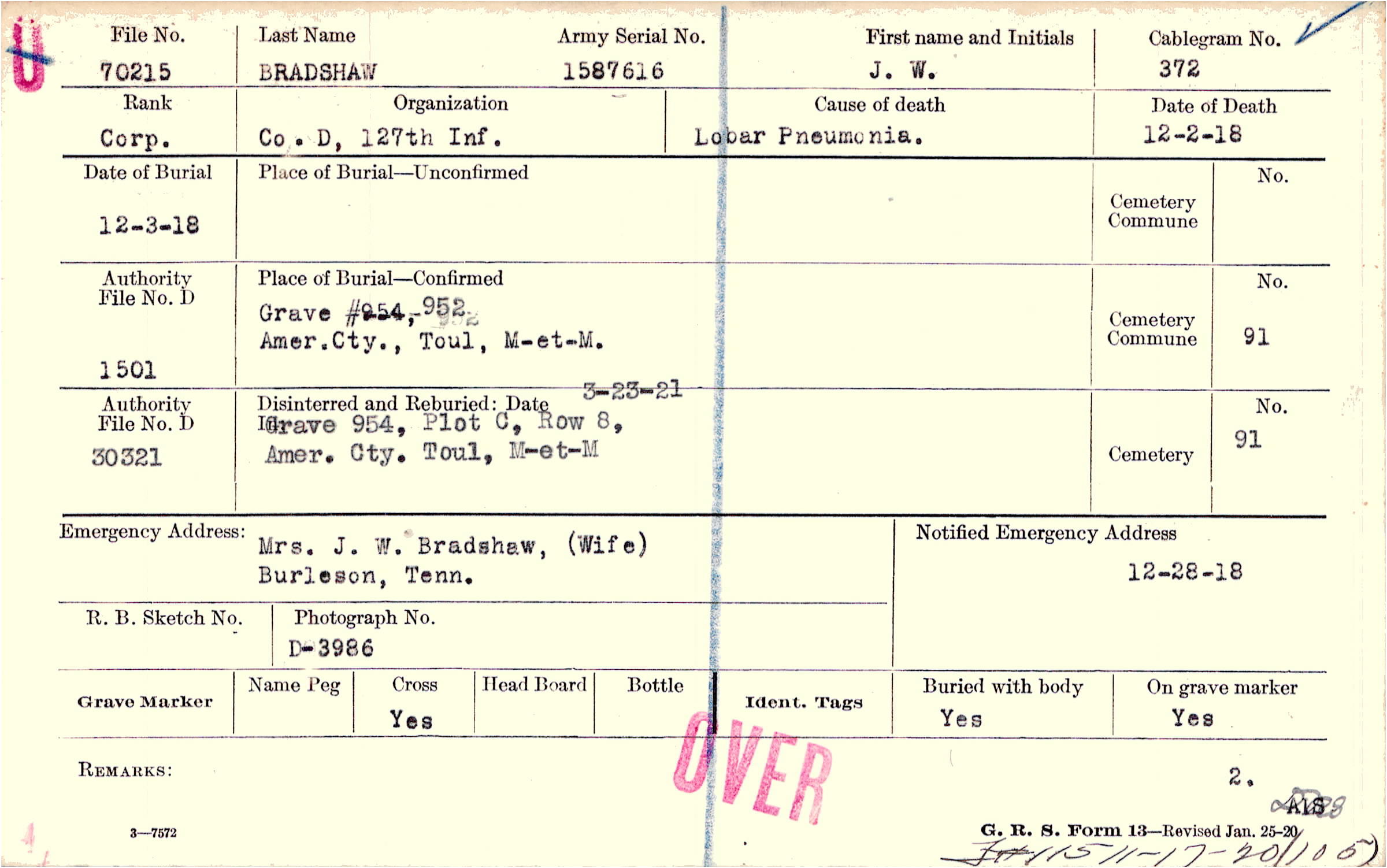 Mrs. J. W. Bradshaw, (Wife), Burleson, Tenn.