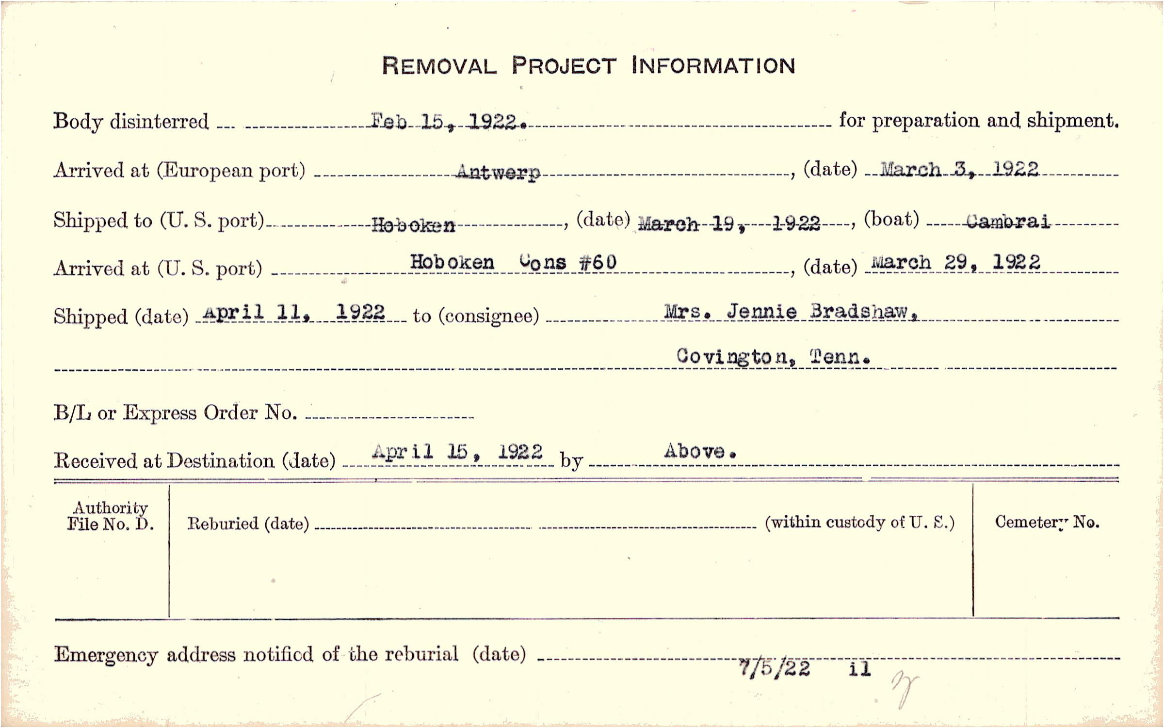 Body disinterred 2/15/1922 for preparation and shipment.