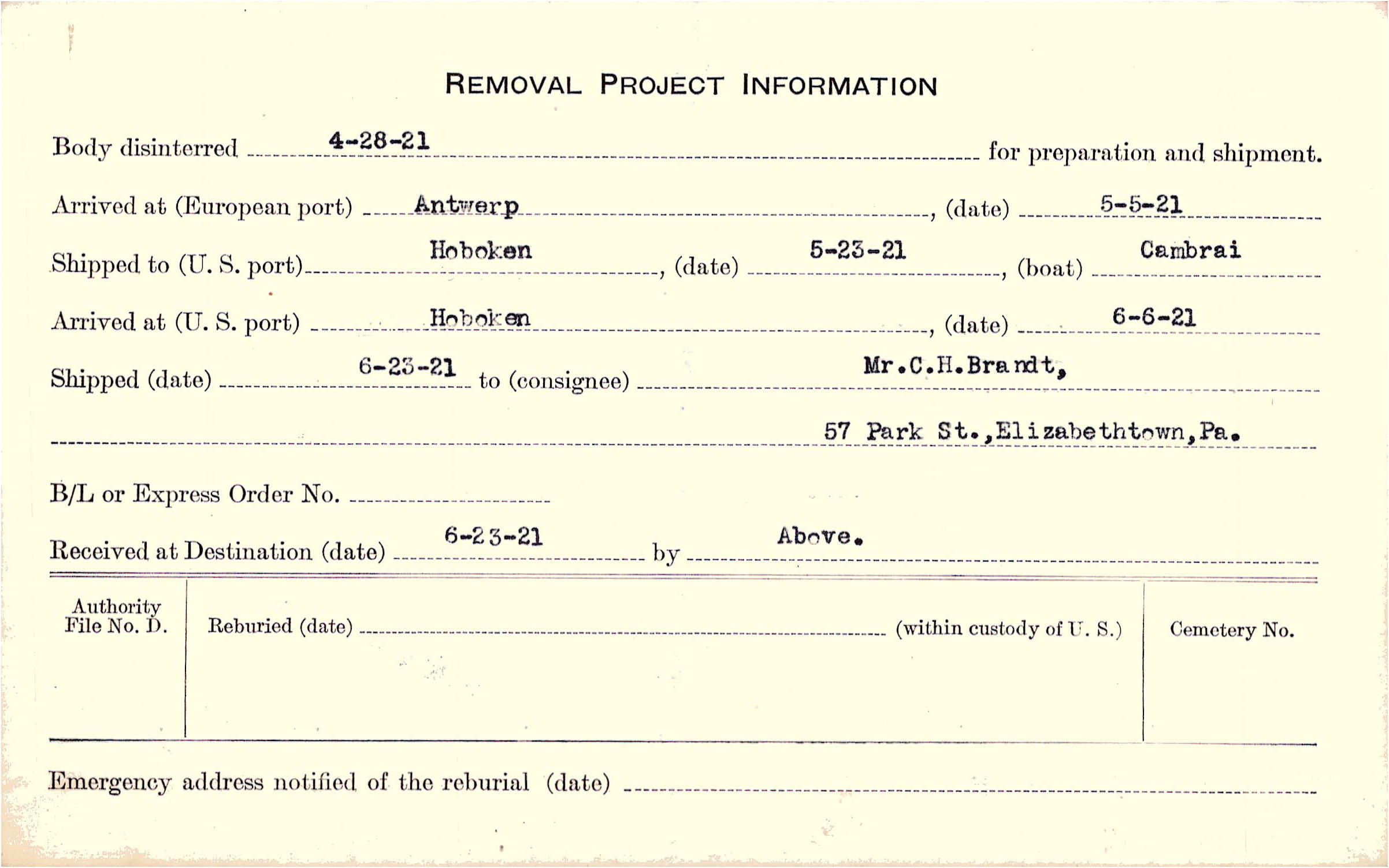 Body disinterred 4/28/1921 for preparation and shipment.
