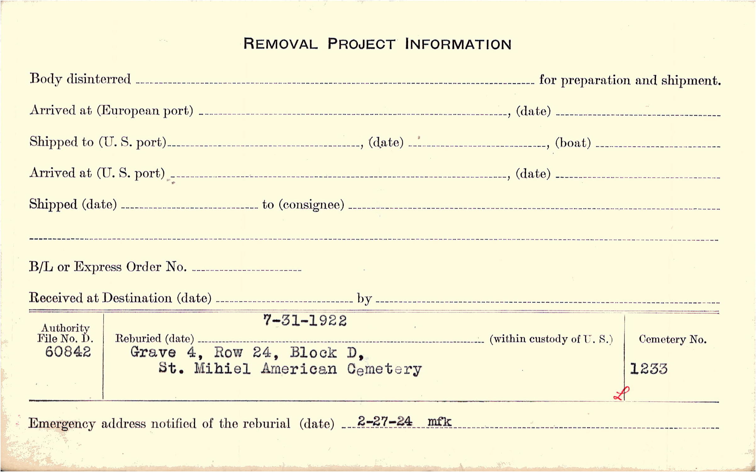| Permanent Burial in Foreign Cemetery |