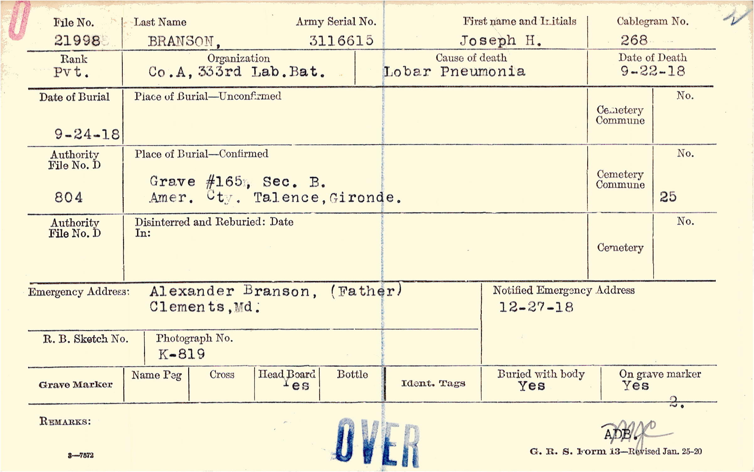 Grave #165, Sec. B., Amer. Cty., Talence, Gironde.