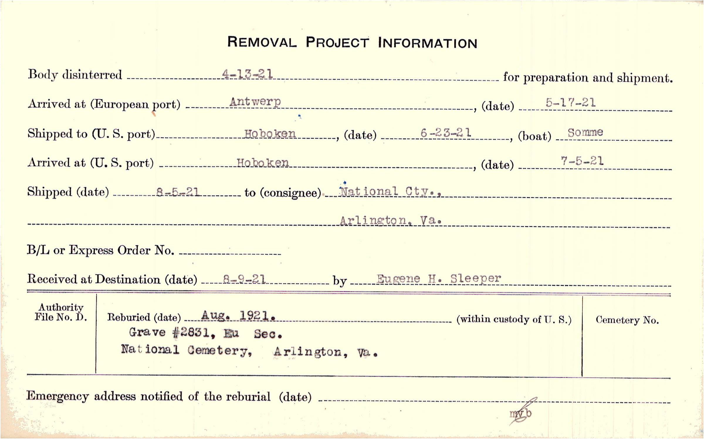Body disinterred 4/13/1921 for preparation and shipment.