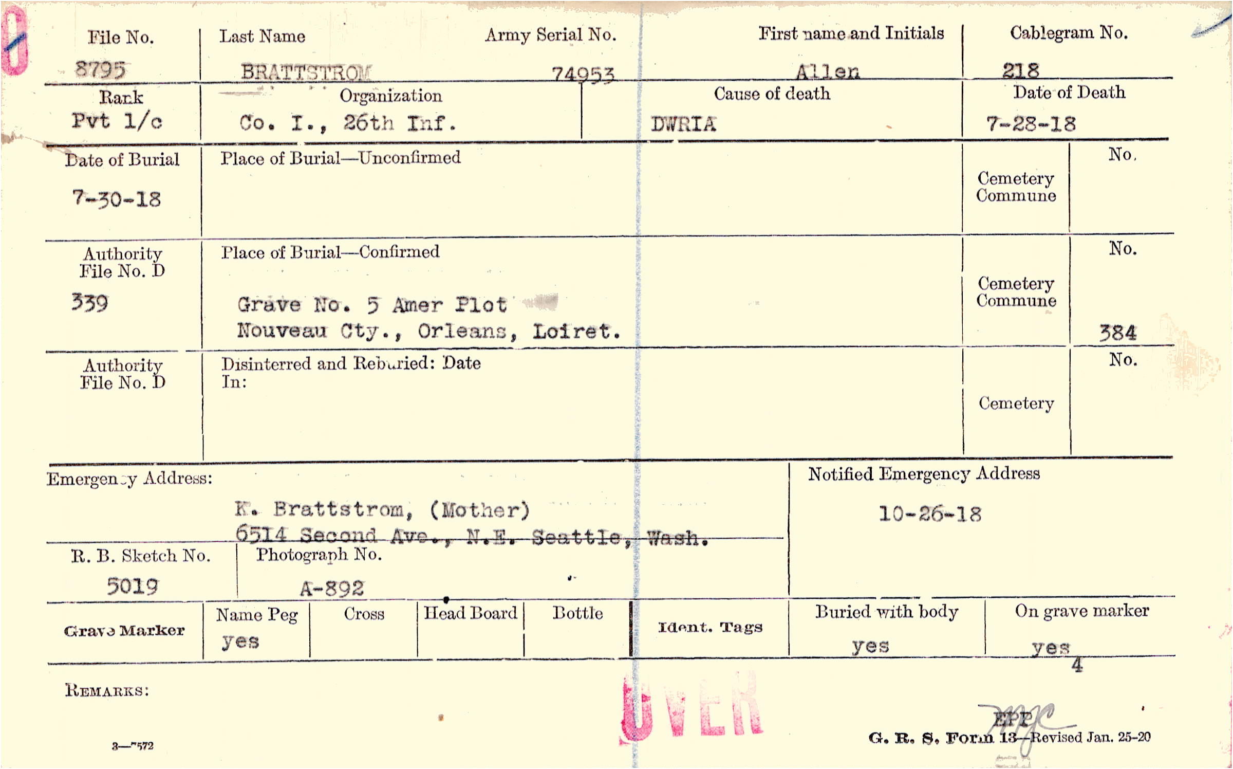 K. Brattstrom, (Mother), 6514 Second Ave., N.E. Seattle, Wash.