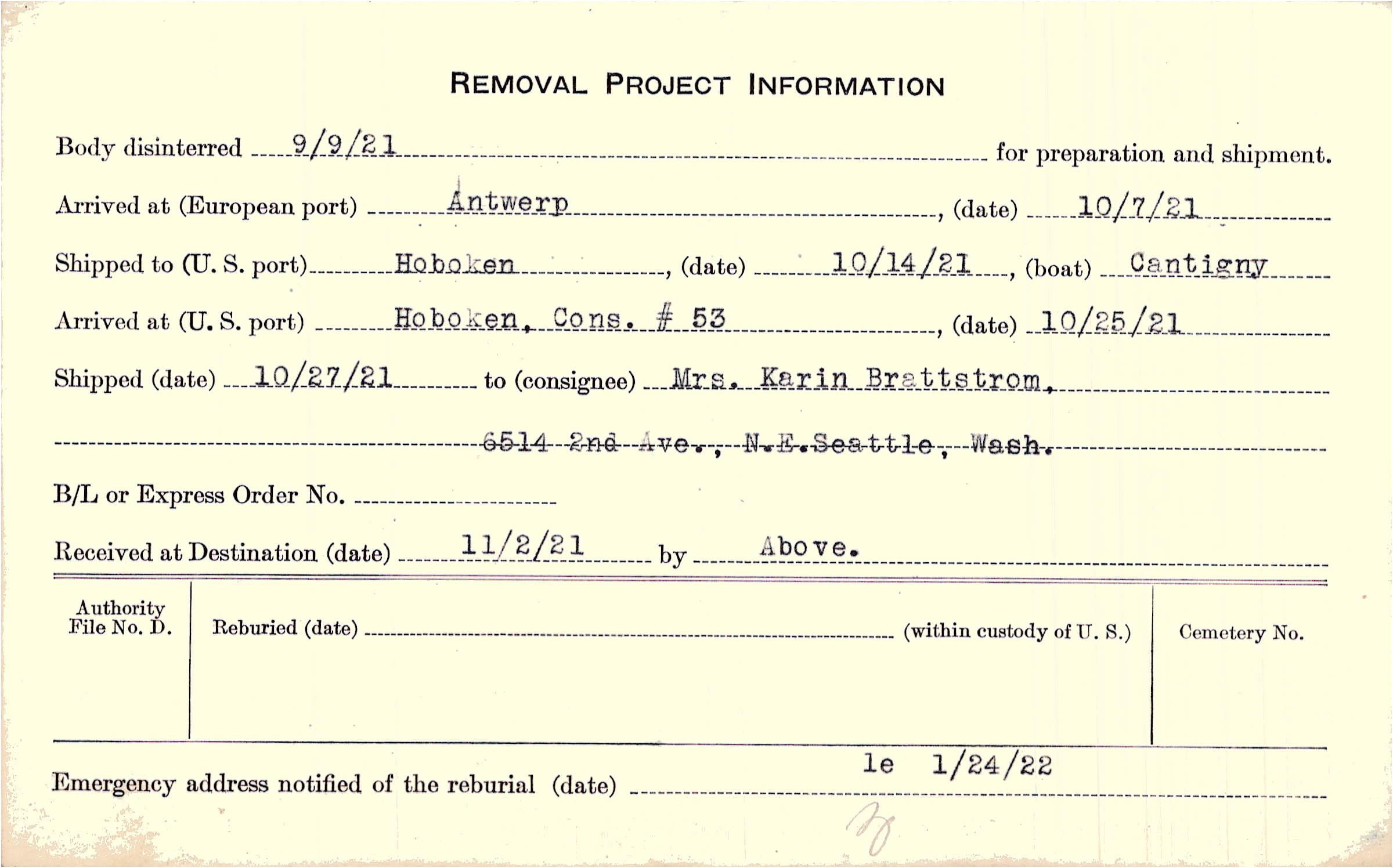 Body disinterred 9/9/1921 for preparation and shipment.