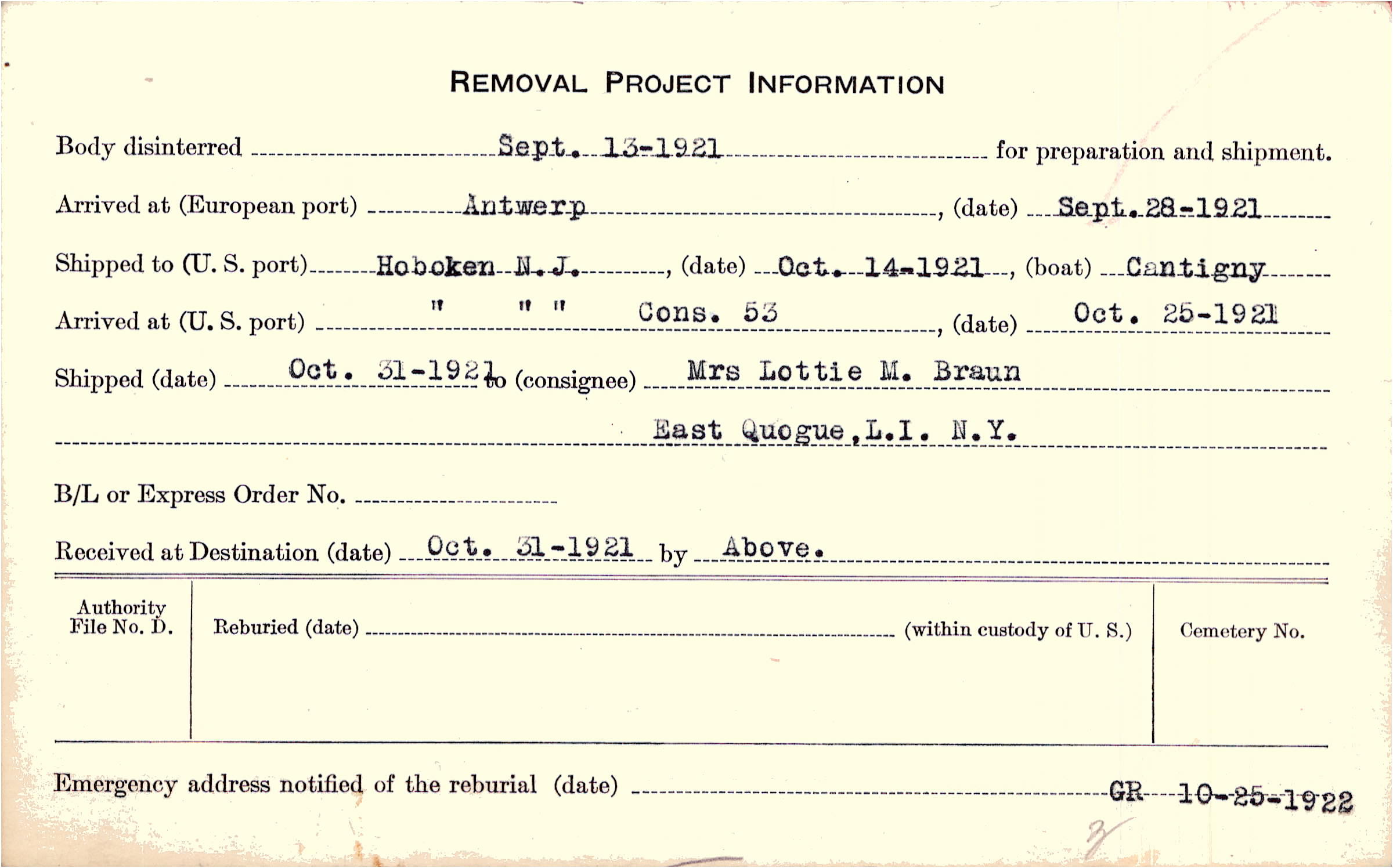 Body disinterred 9/13/1921 for preparation and shipment.
