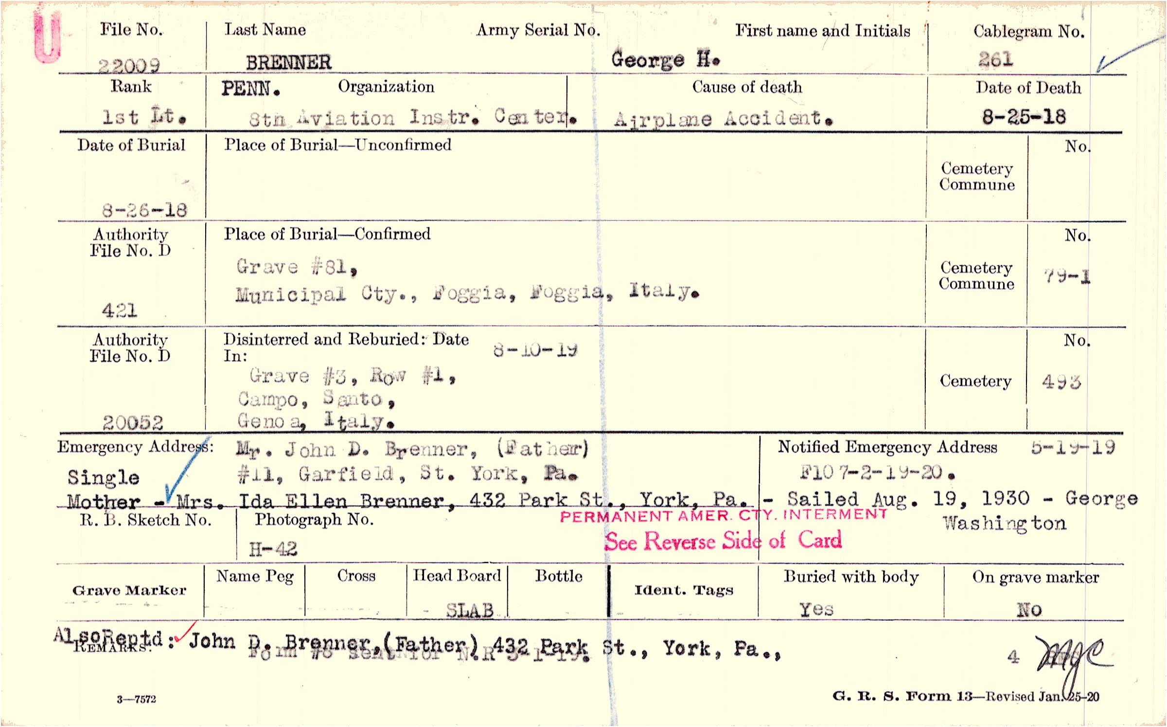 Mr. John D. Brenner, (Father), #11, Garfield, St. York, Pa., Single Mother - Mrs. Ida Ellen Brenner, 432 Park St., York, Pa. - Sailed Aug. 19, 1930 - George Washington