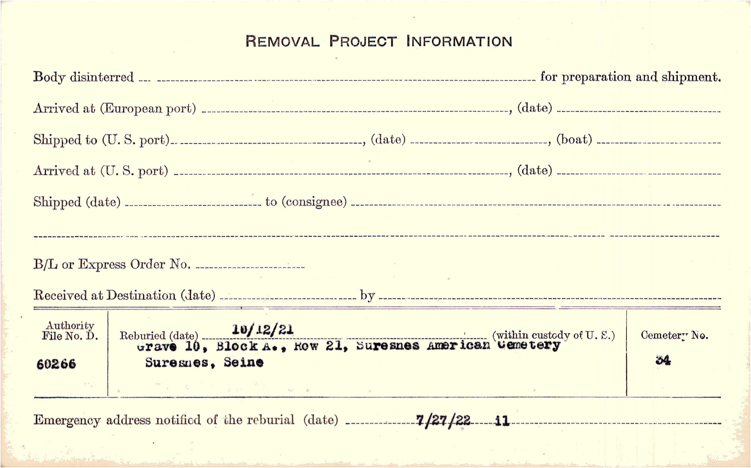 | Permanent Burial in Foreign Cemetery |