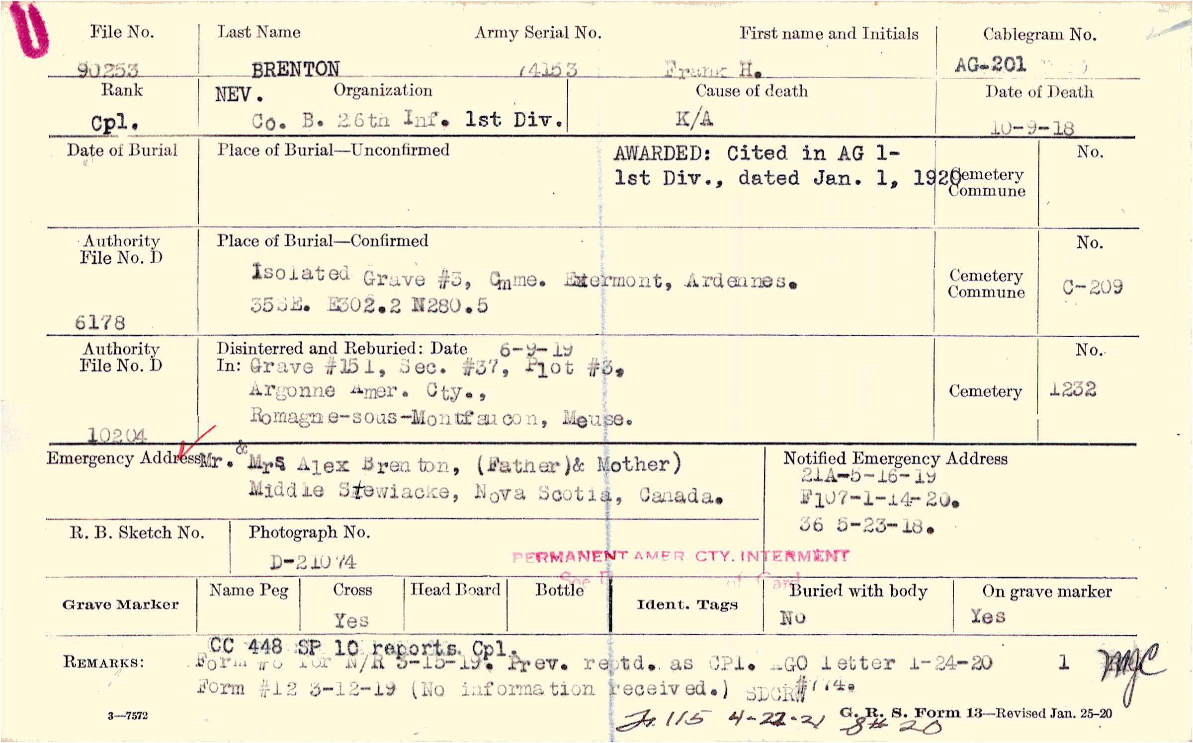 CC 448 SP 10 reports Cpl. Prev. reptd. as CPl. AGO letter 1-24-20, Form #8 for N/R 3-15-19., Form #12 3-12-19 (No information received.), F.115 4-22-21 S#20, SDCR # 774