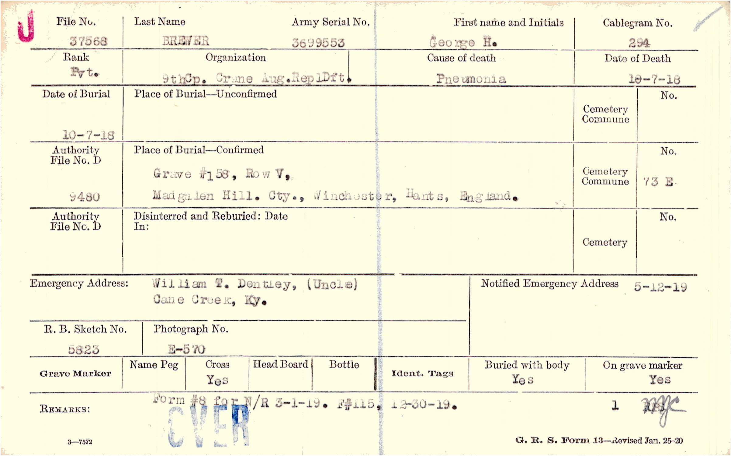 Grave #158, Row V, Madgalen Hill. Cty.., Wichester, Hants, England.