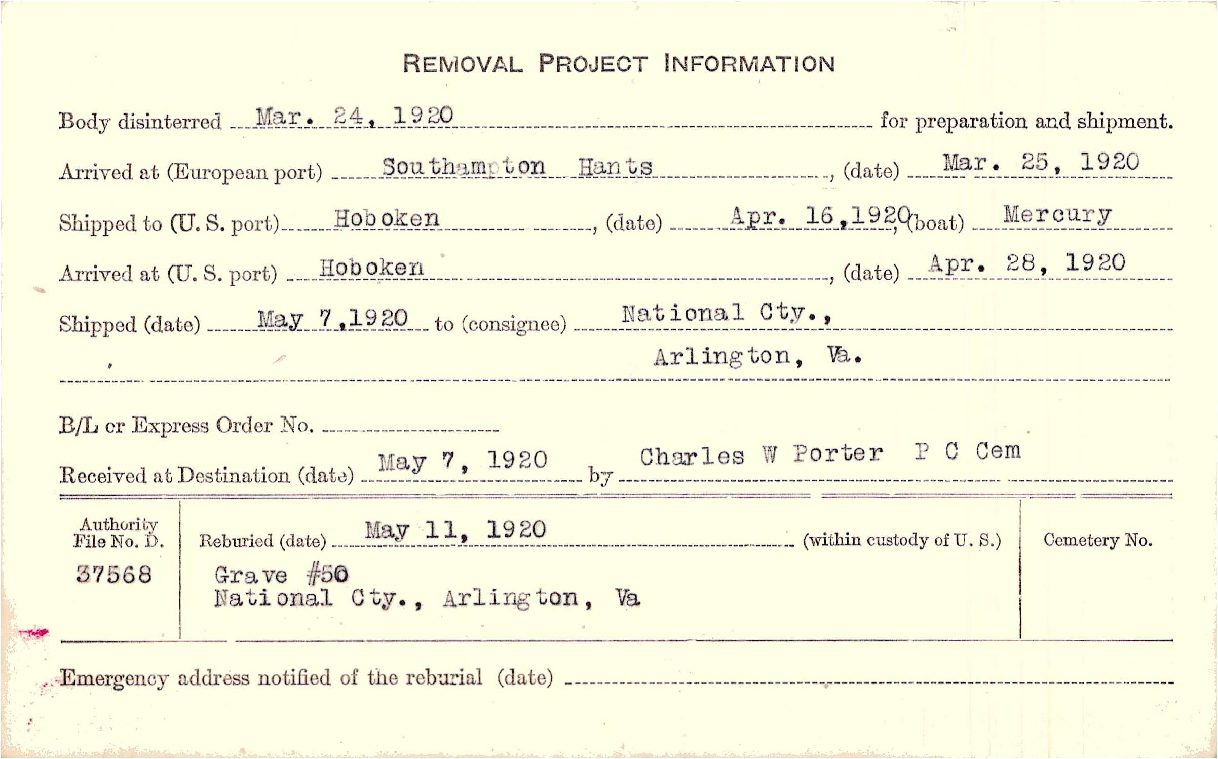 Body disinterred 3/24/1920 for preparation and shipment.