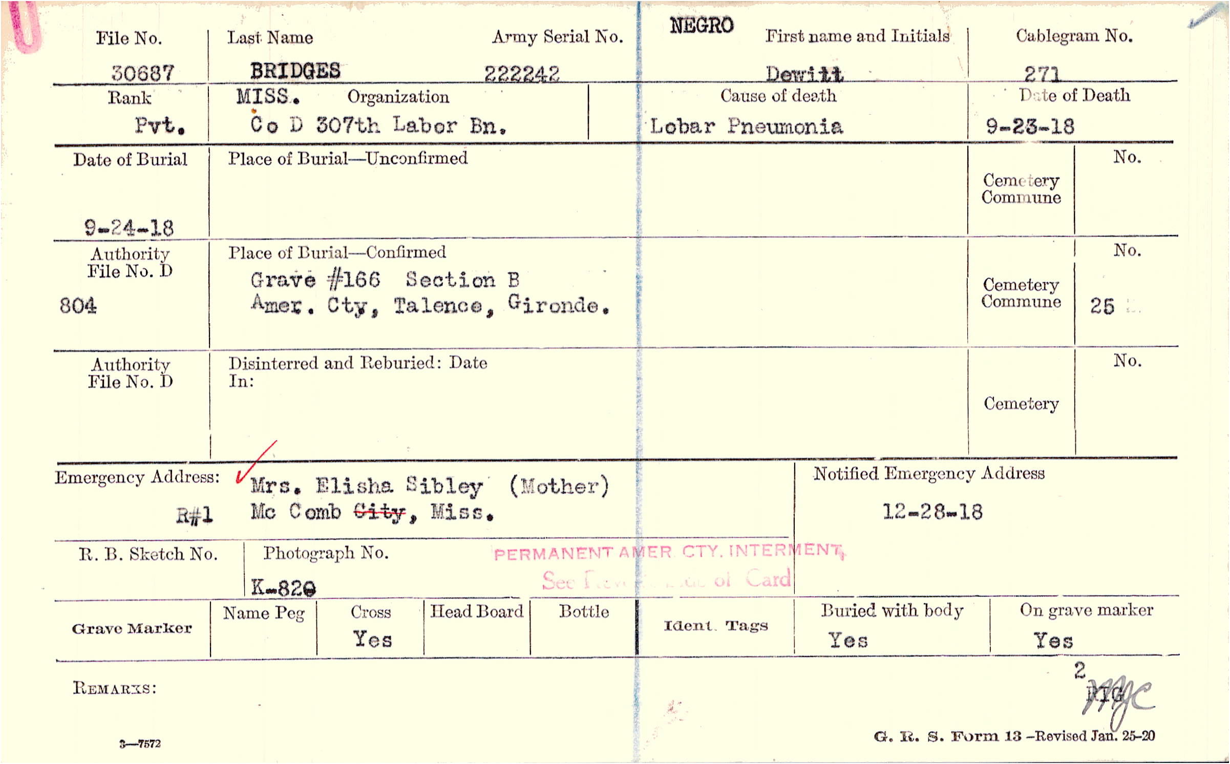 Grave #166, Section B, Amer. Cty., Talence, Gironde.