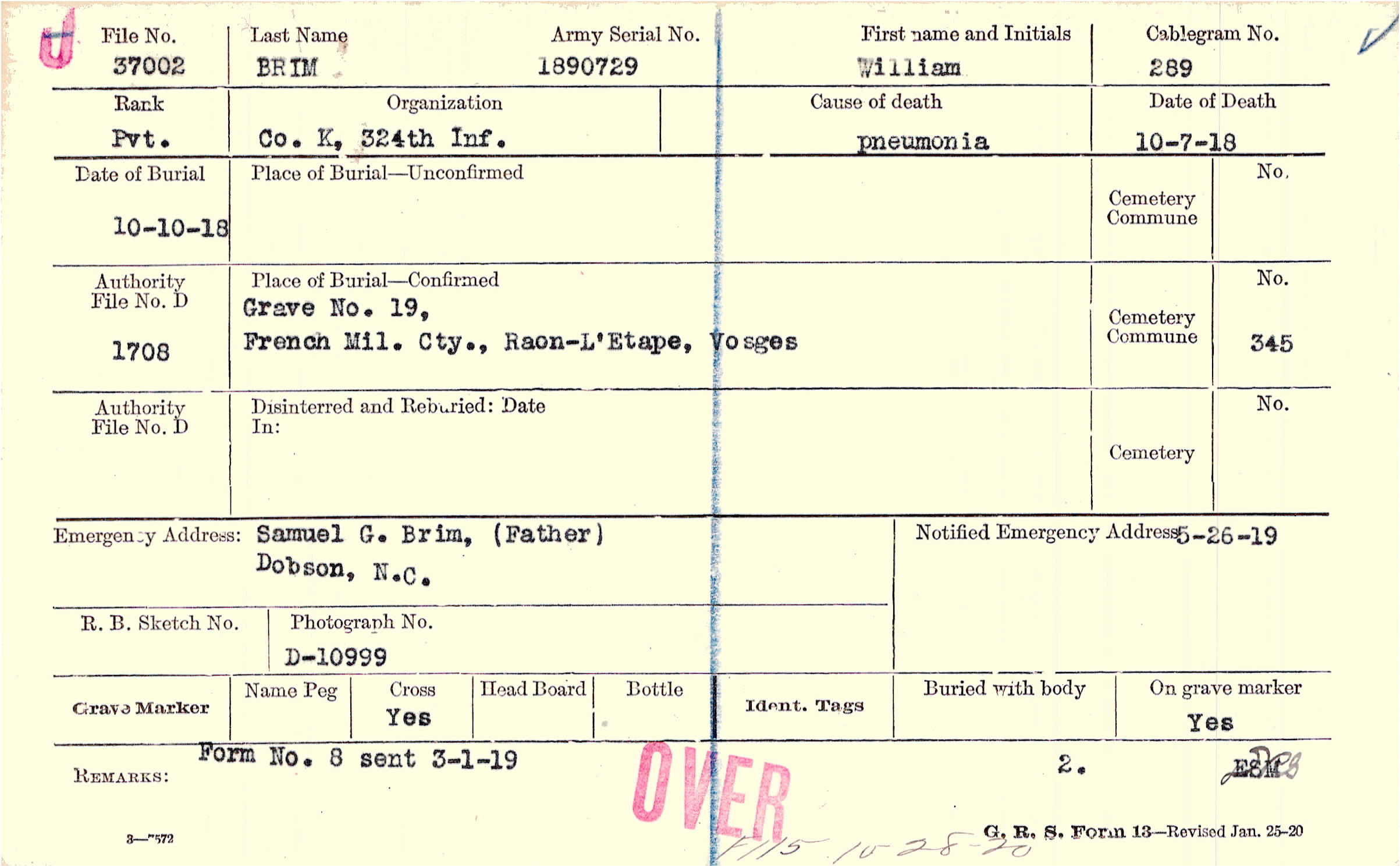 Samuel G. Brim, (Father), Dobson, N.C., Form No. 8 sent 3-1-19