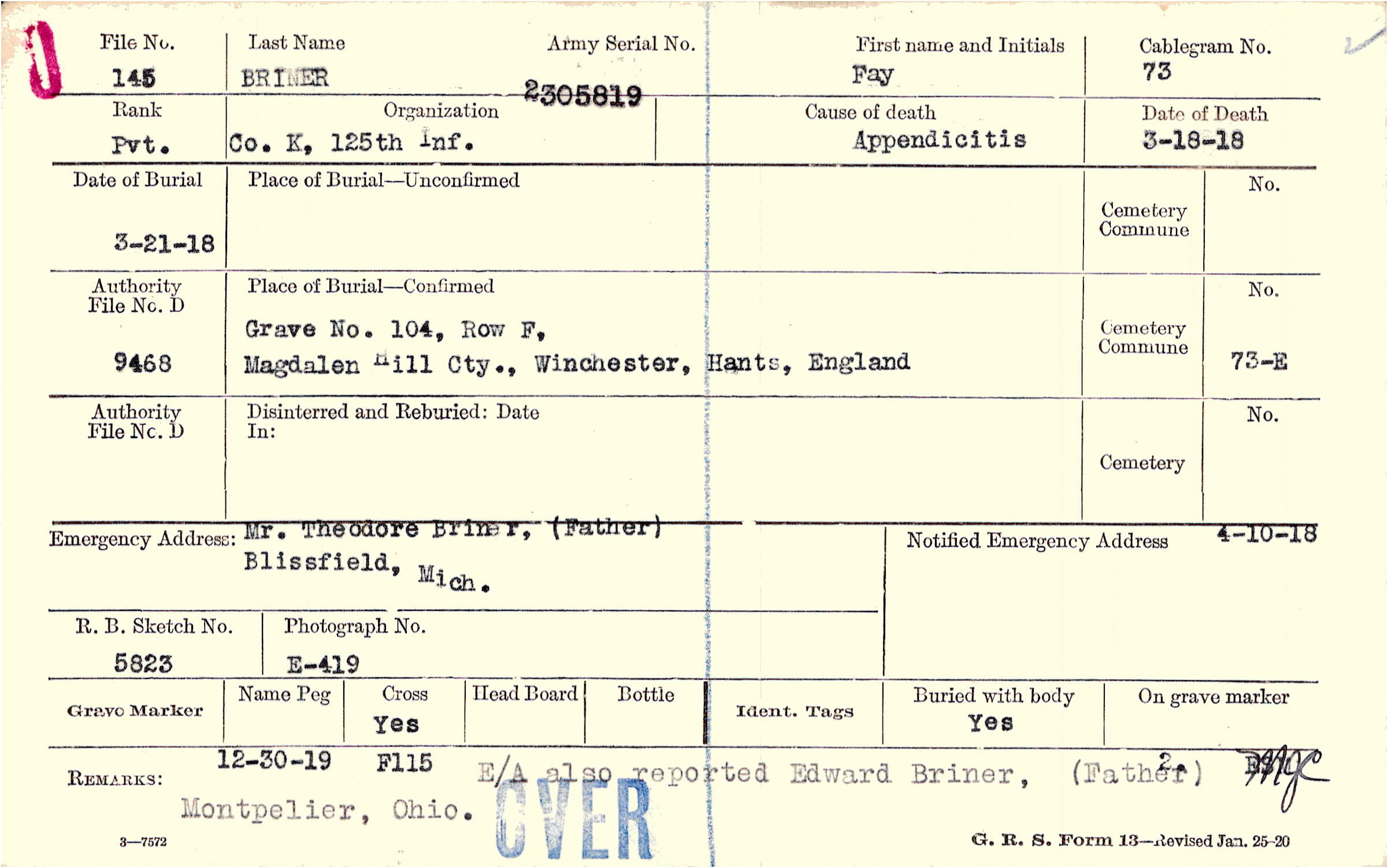 E/A also reported Edward Briner, (Father) Montpelier, Ohio., 12-30-19 F115 E/A also reported Edward Briner, (Father) Montpelier, Ohio.