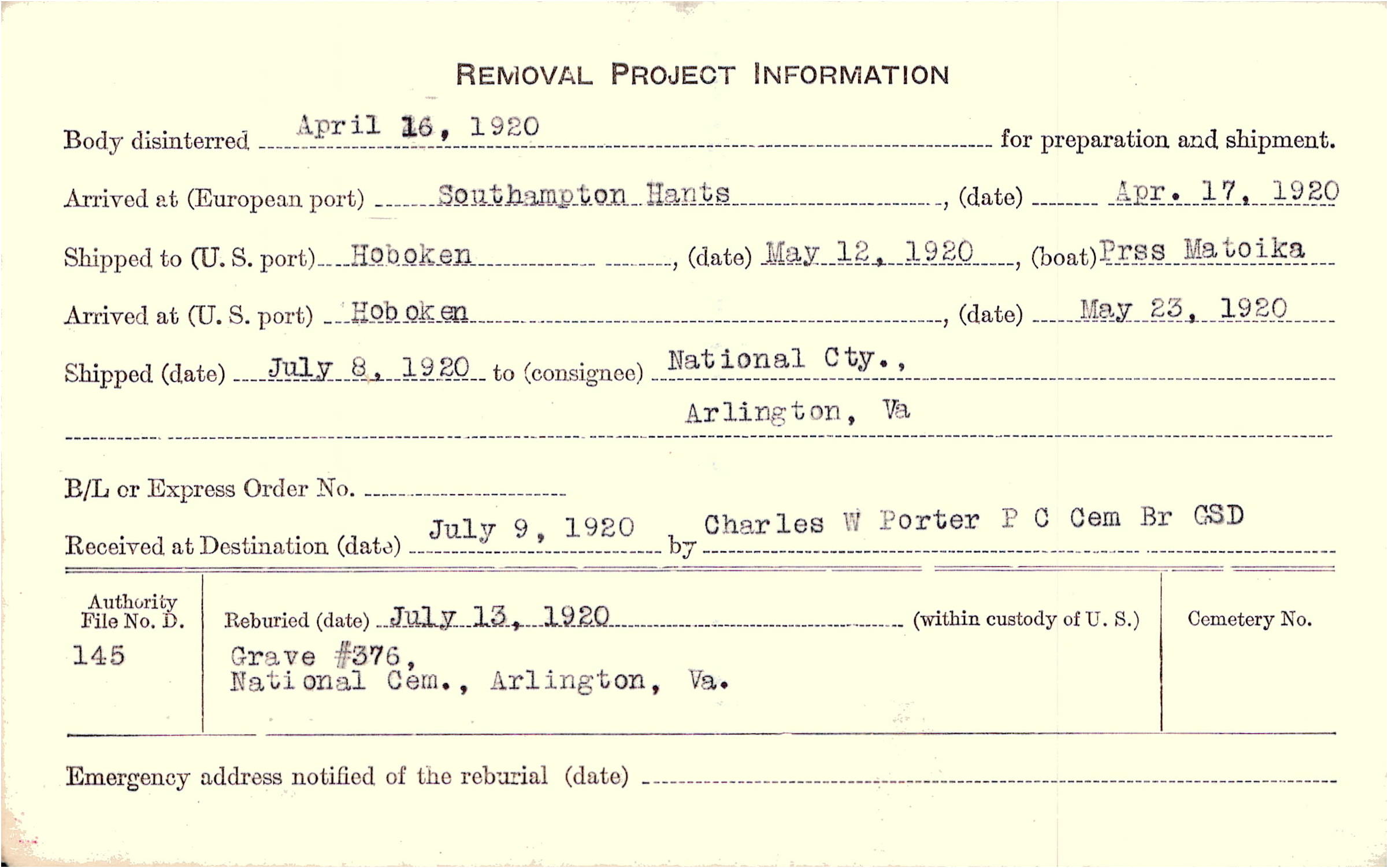 Body disinterred 4/16/1920 for preparation and shipment.