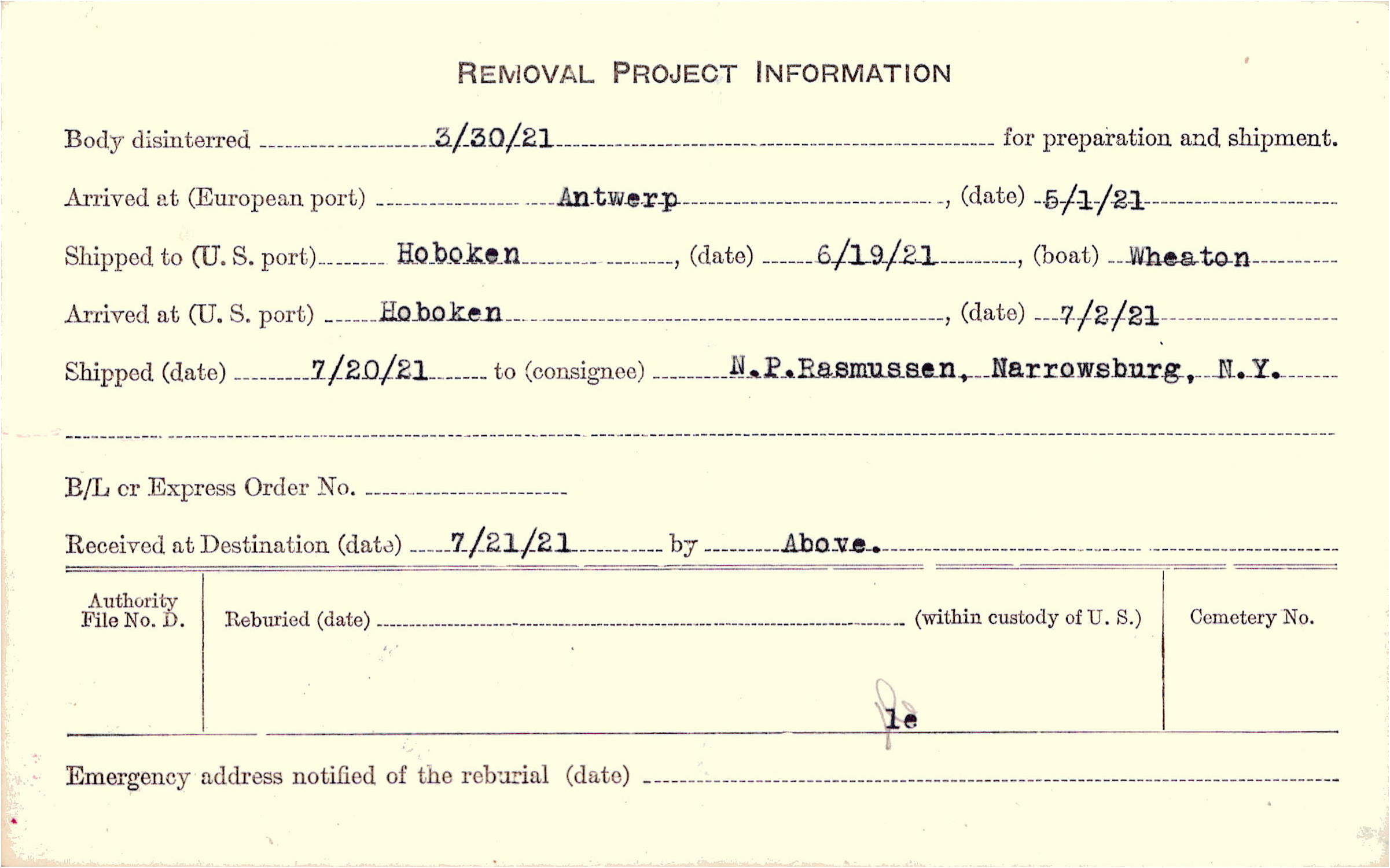 Body disinterred 3/30/1921 for preparation and shipment.