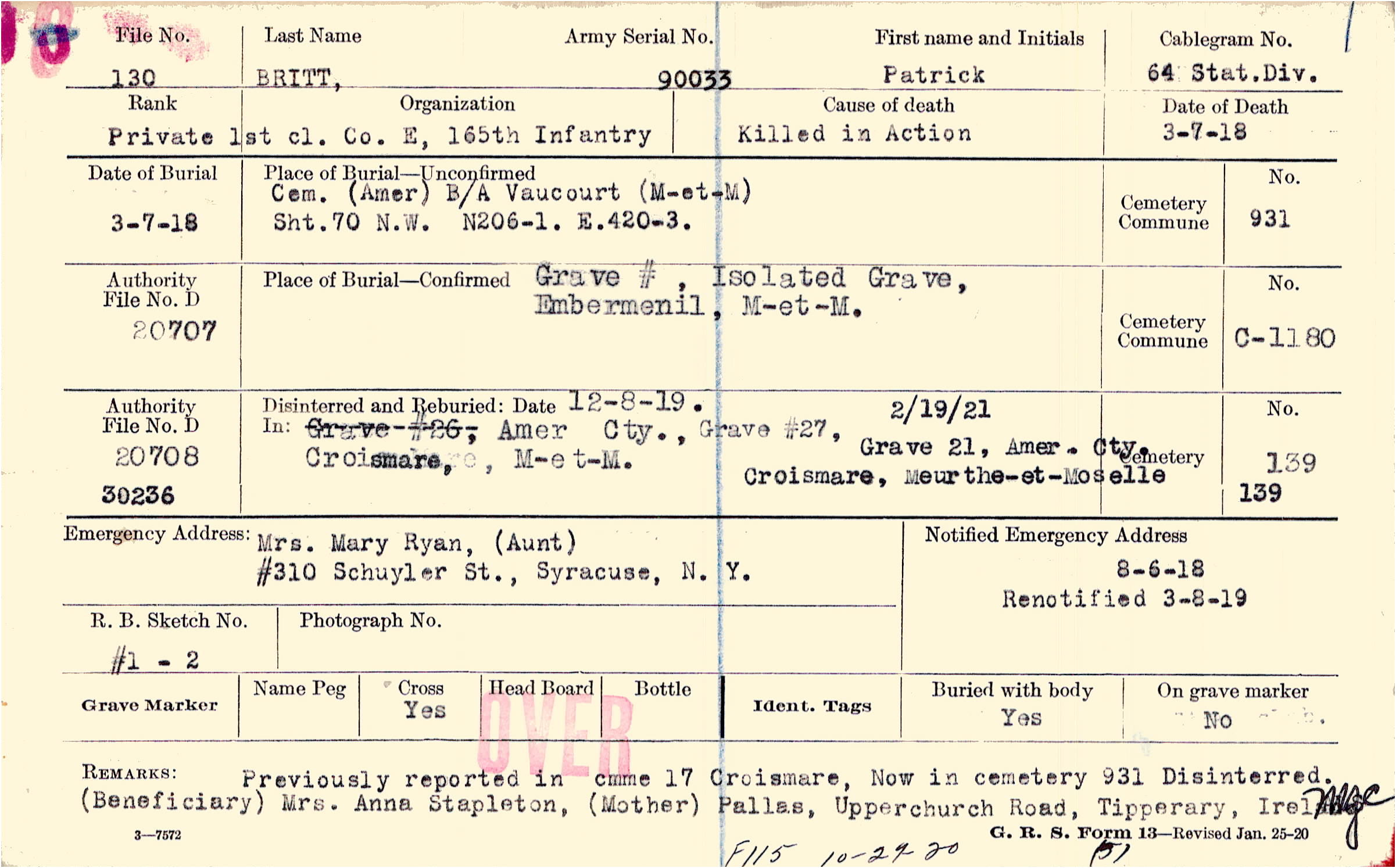 Previously reported in cmme 17 Croismare, Now in cemetery 931 Disinterred. (Beneficiary) Mrs. Anna Stapleton, (Mother) Pallas, Upperchurch Road, Tipperary, Ireland.