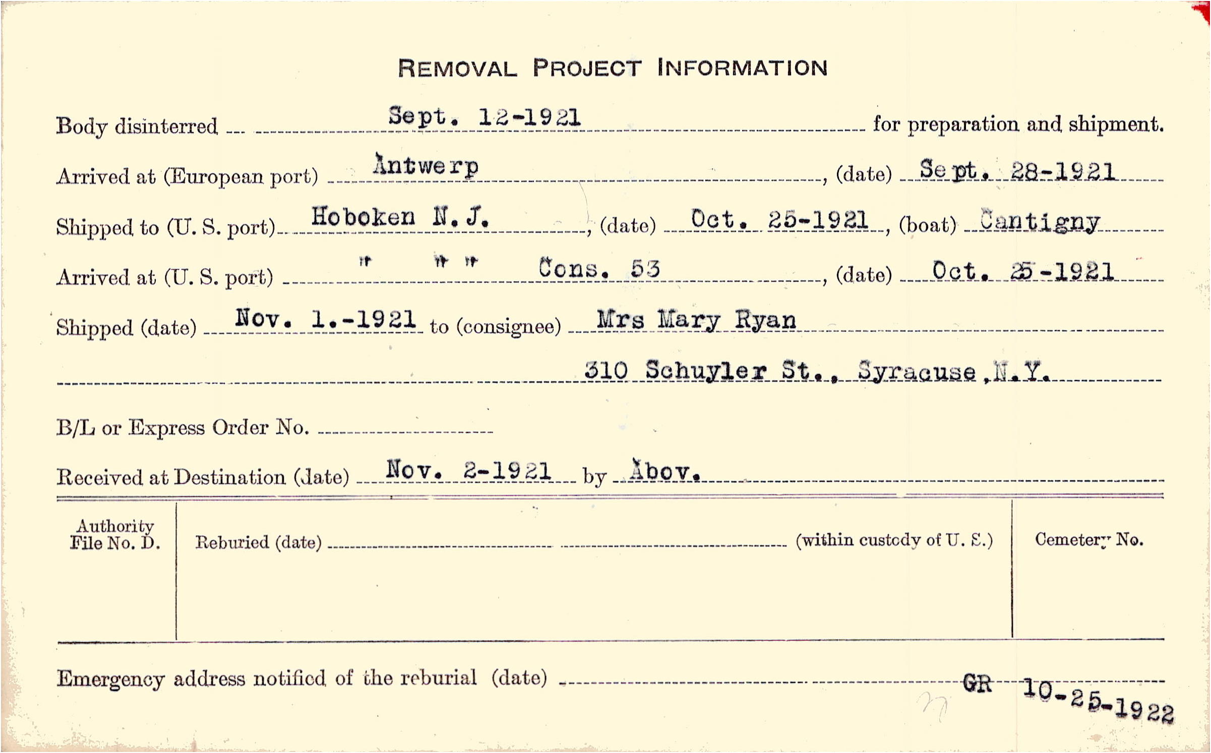 Body disinterred 9/12/1921 for preparation and shipment.