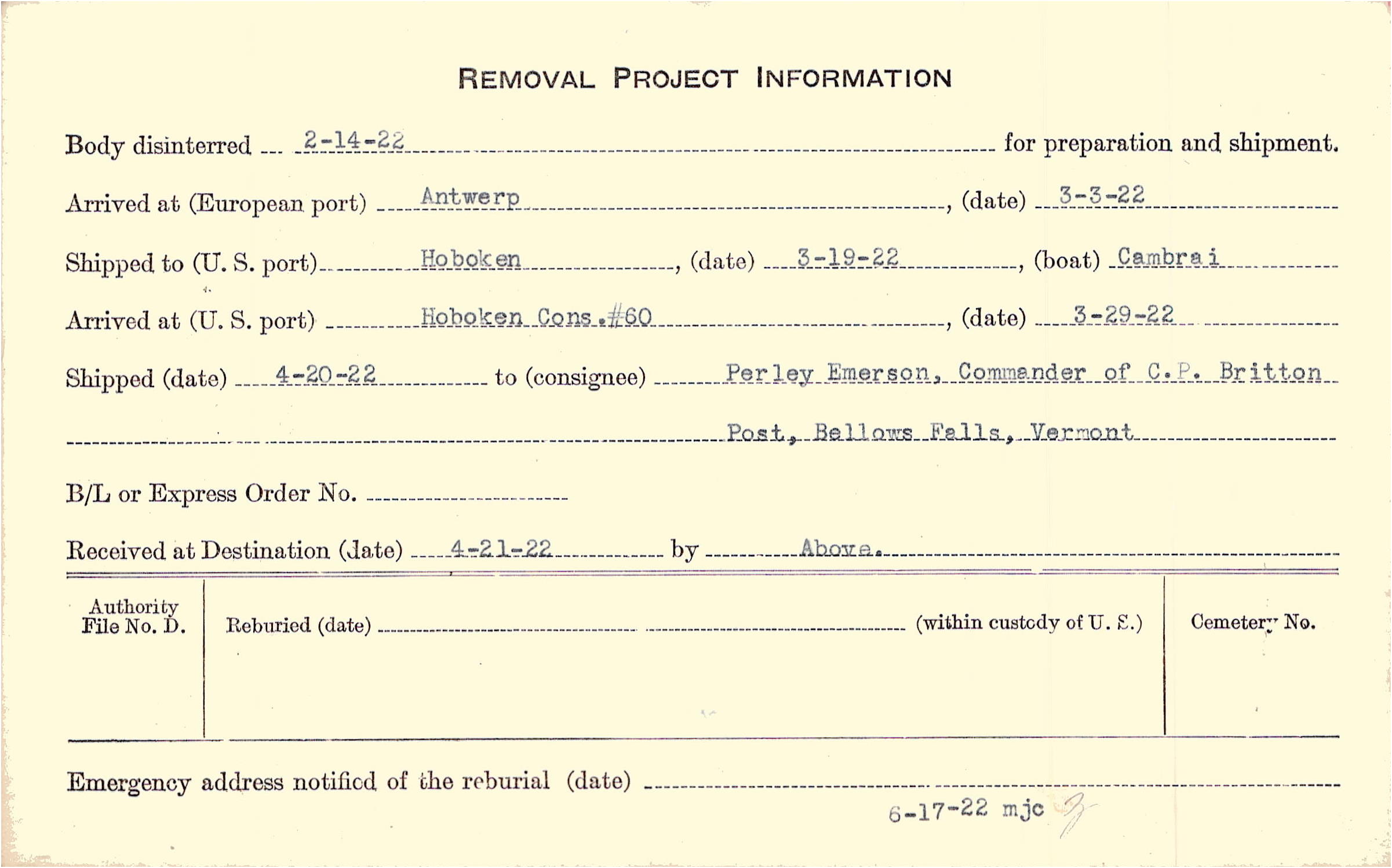 to Perley Emerson, Commander of C. P. Britton Post, Bellows Falls, Vermont