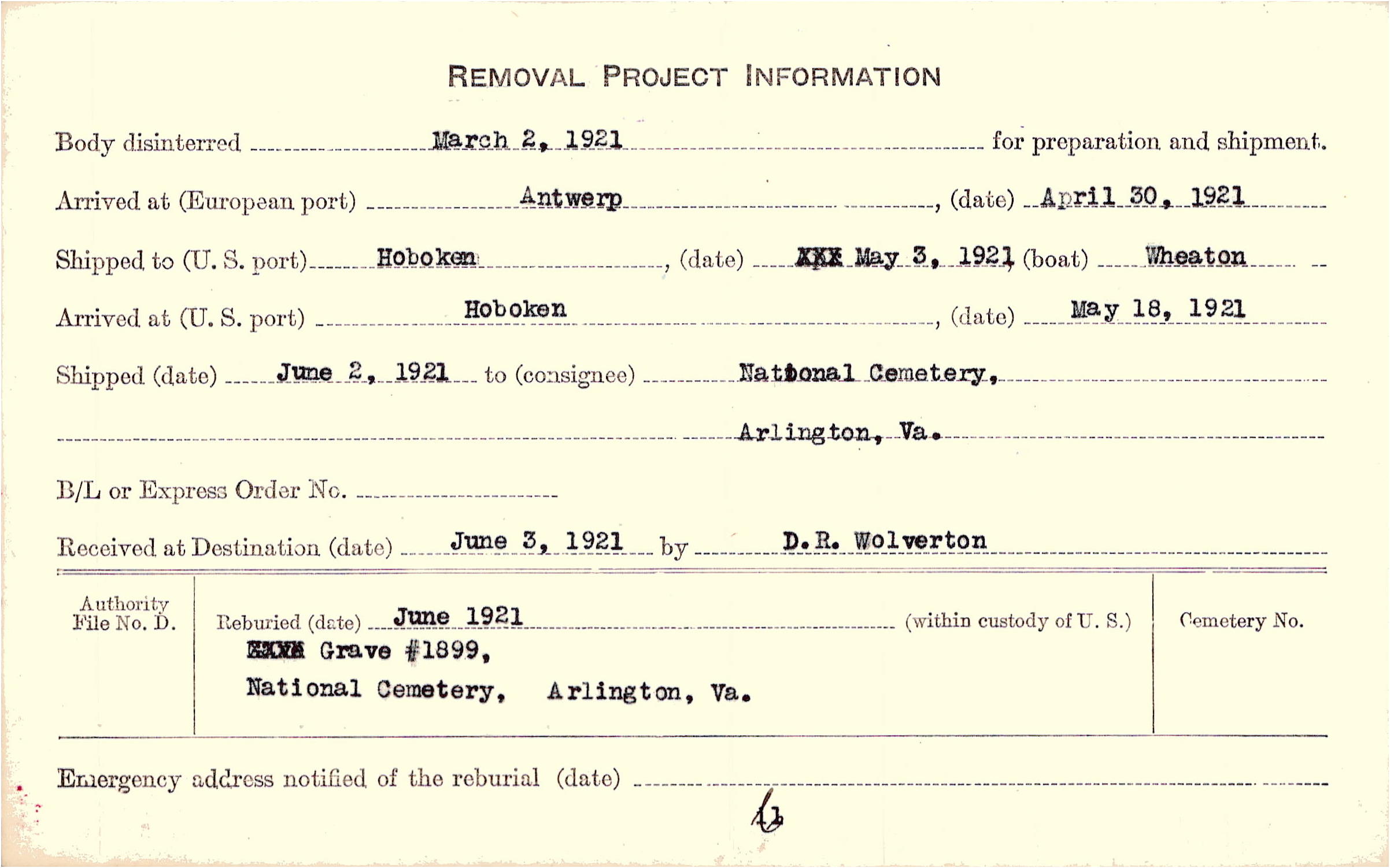 Body disinterred 3/2/1921 for preparation and shipment.