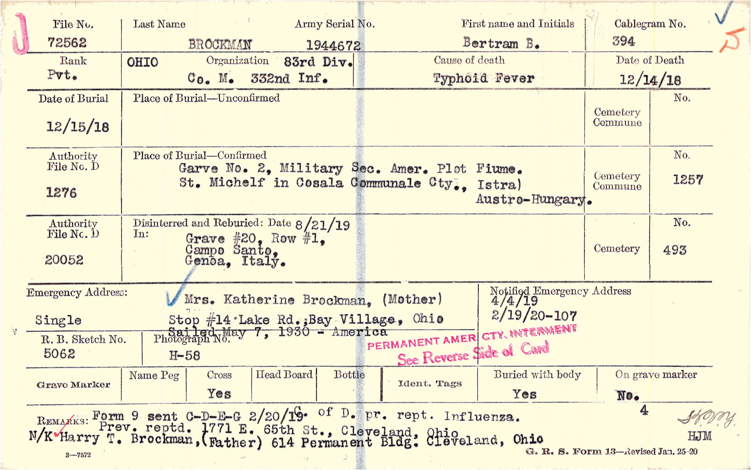 C. of D. pr. rept. Influenza. Prev. reptd. 1771 E. 65th St., Cleveland, Ohio, N/K Harry T. Brockman, (Father) 614 Permanent Bldg. Cleveland, Ohio