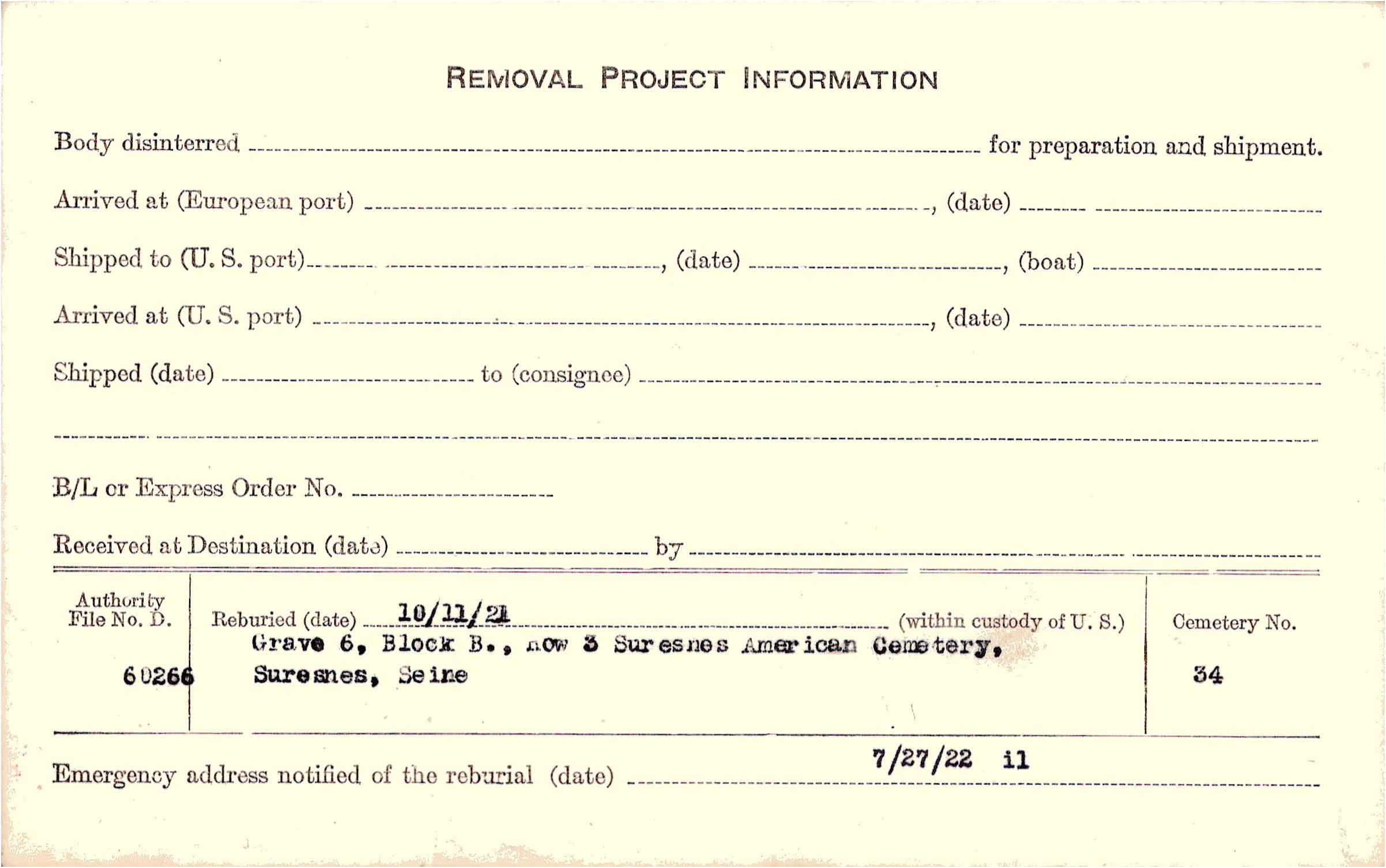 | Permanent Burial in Foreign Cemetery |