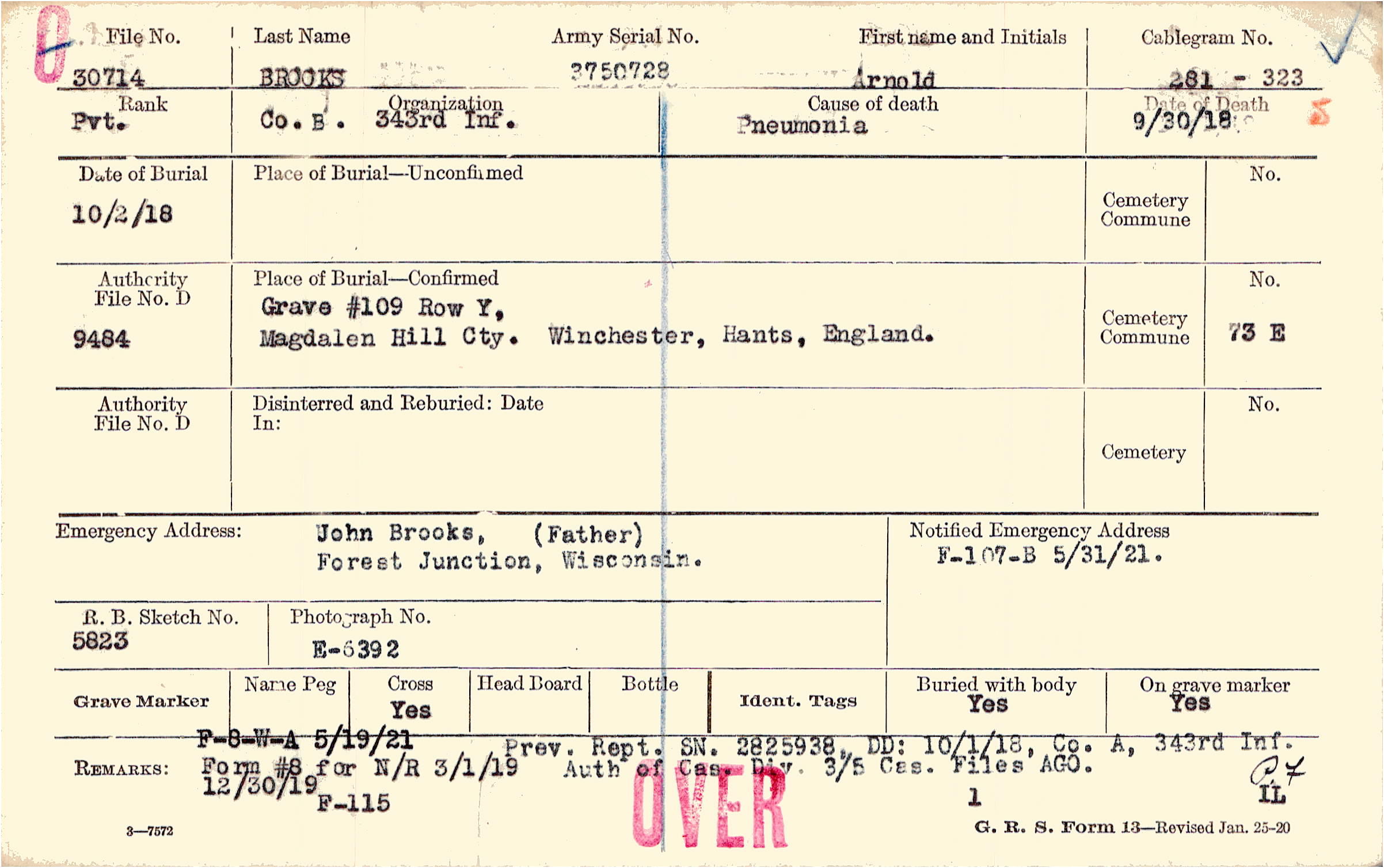 Prev. Rept. SN. 2825938, DD: 10/1/18, Co. A, 343rd Inf. Auth of Cas. Div 3/5/ Cas. Files AGO., F-8-W-A 5/19/21 Form #8 for N/R 3/1/19 Prev. Rept. SN. 2825938, DD: 10/1/18, Co. A, 343rd Inf. Auth of Cas. Div. 3/5 Cas. Files AGO., 12/30/19 F-115