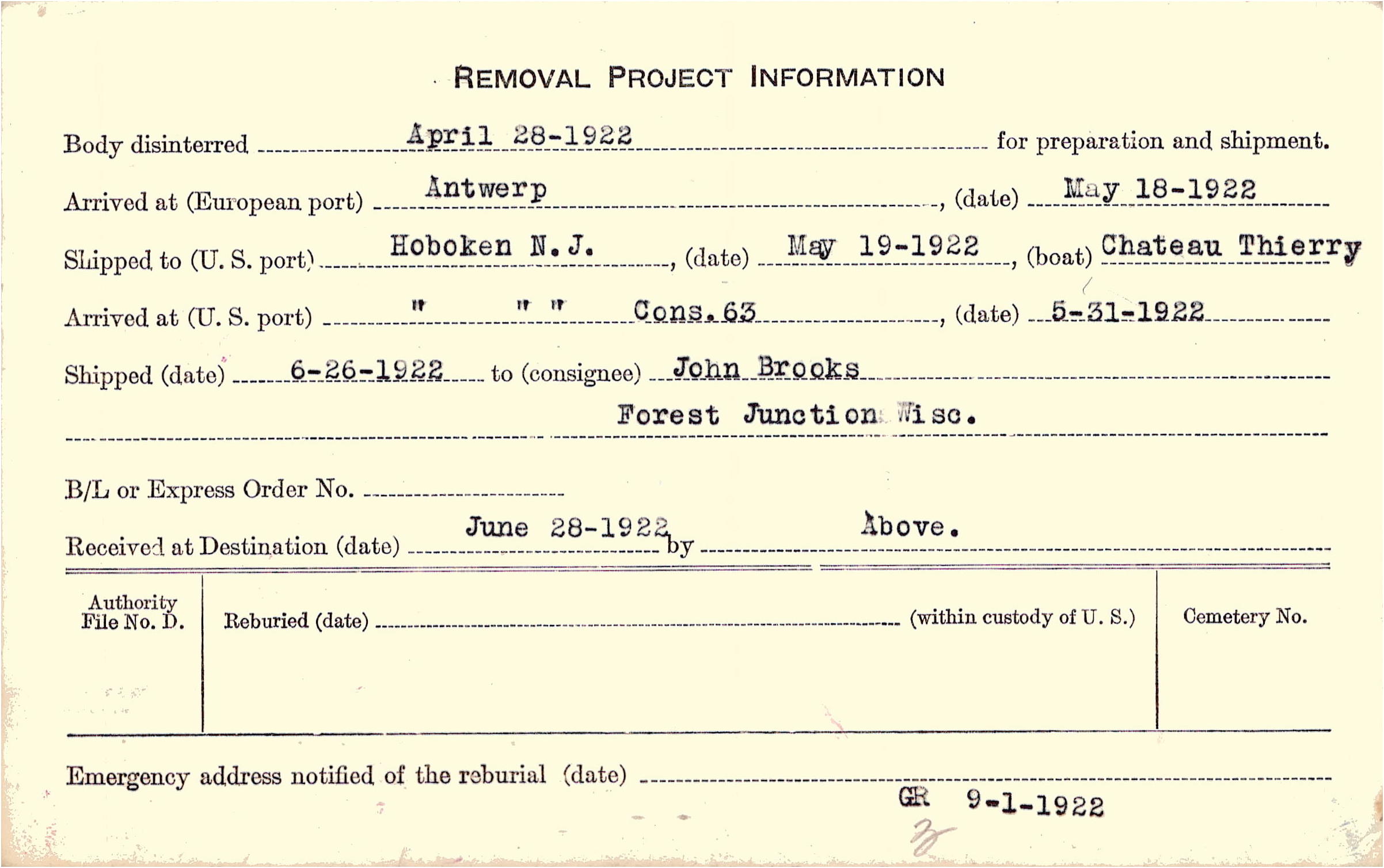 Body disinterred 4/28/1922 for preparation and shipment.