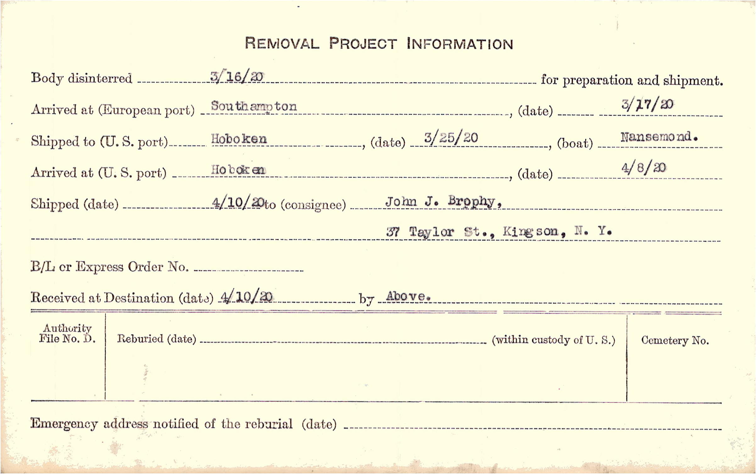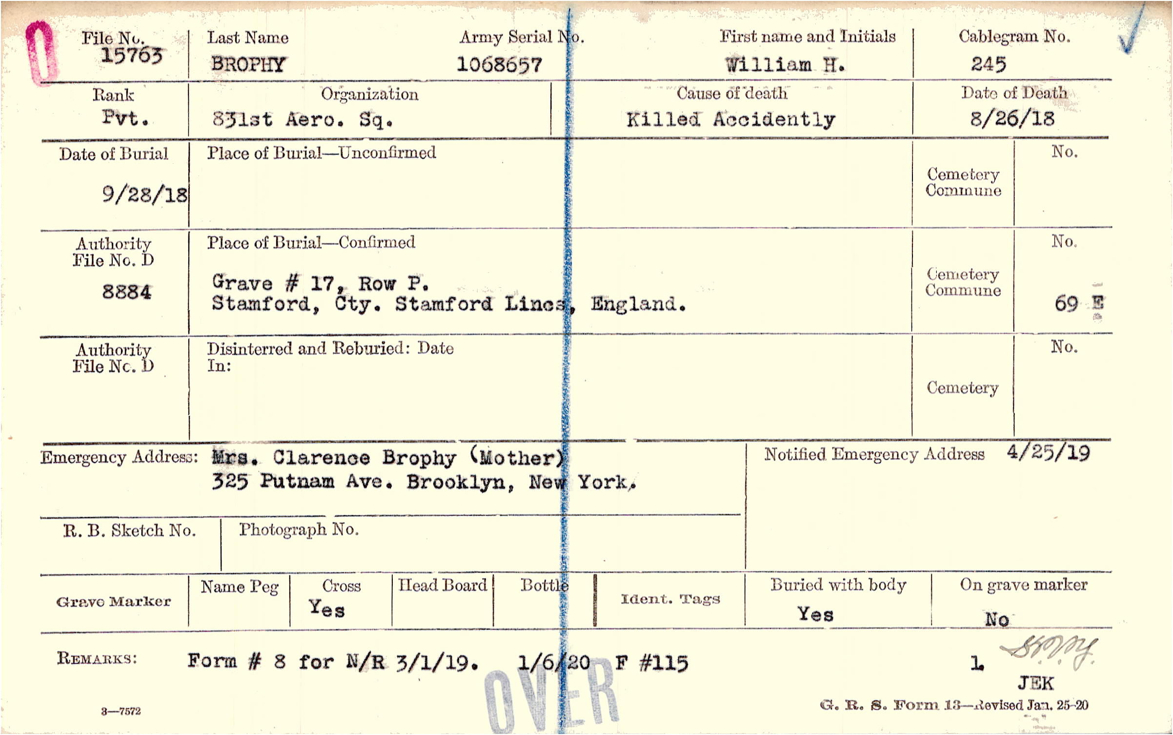 Mrs. Clarence Brophy (Mother), 325 Putnam Ave. Brooklyn, New York.