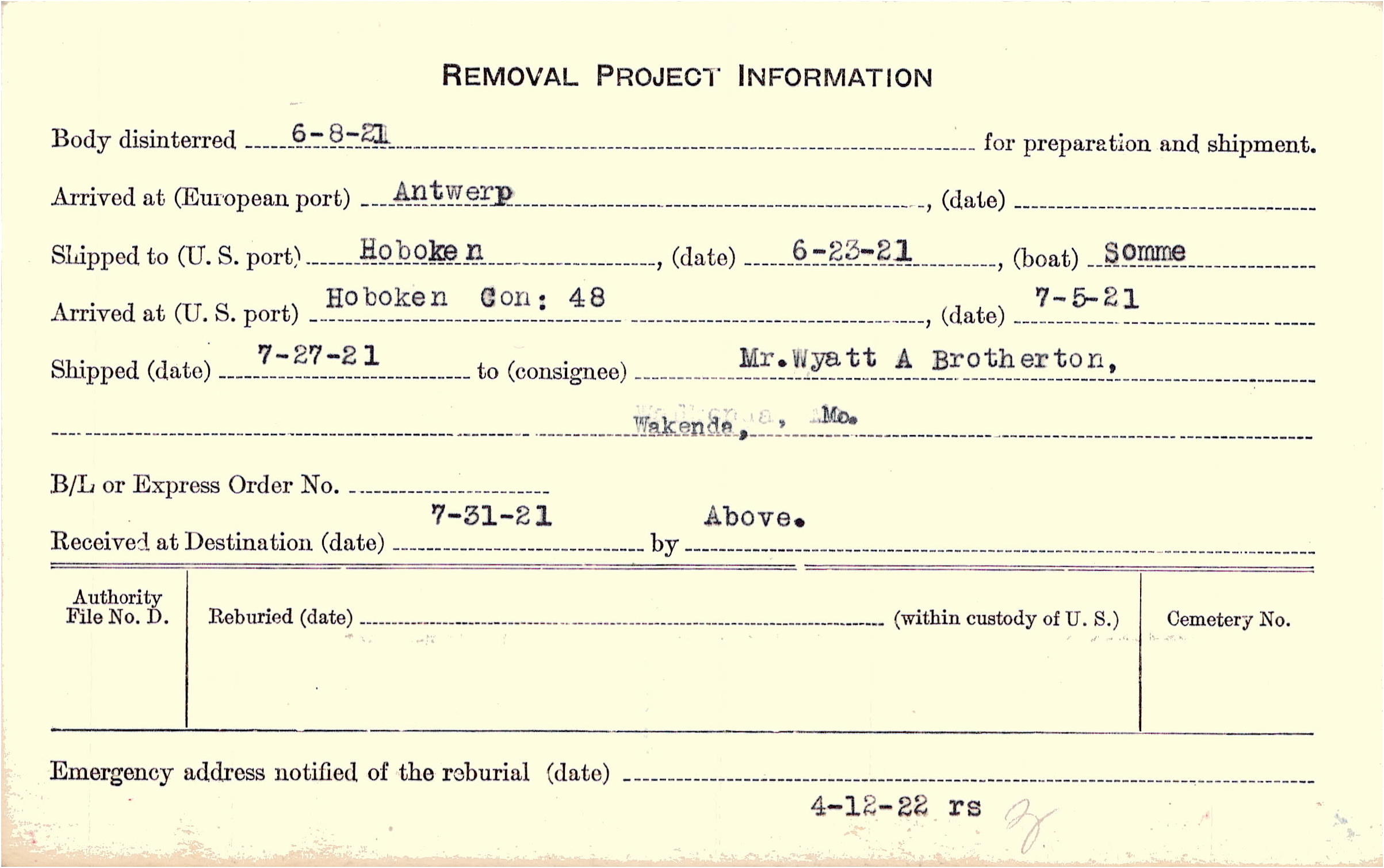to Mr. Wyatt A Brotherton, Wakende, Mo.