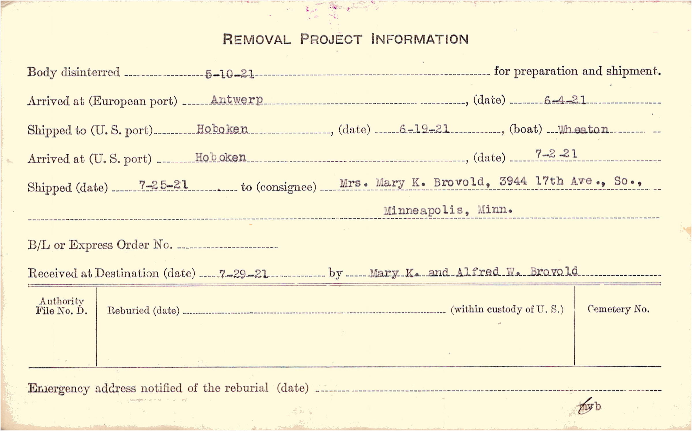 Body disinterred 5/10/1921 for preparation and shipment.