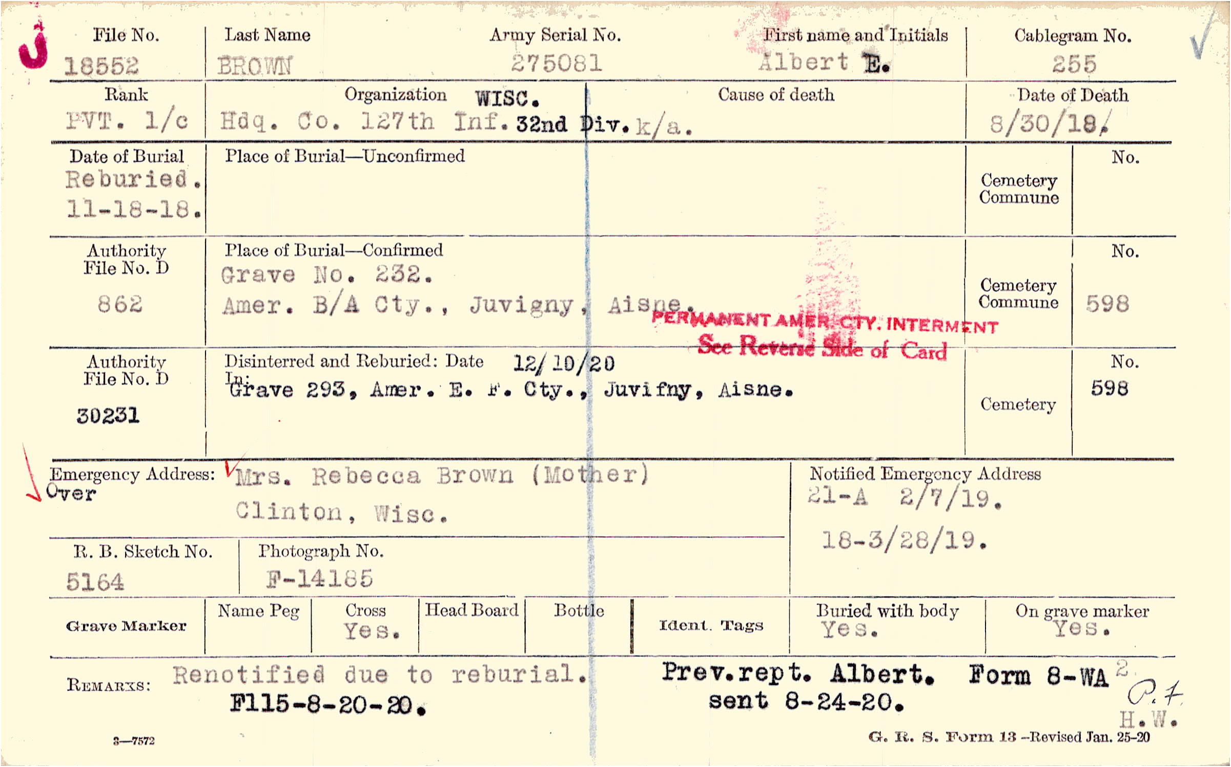 Renotified due to reburial., Prev. rept. Albert. Form 8-WA sent 8-24-20., F115 -8-20-20.