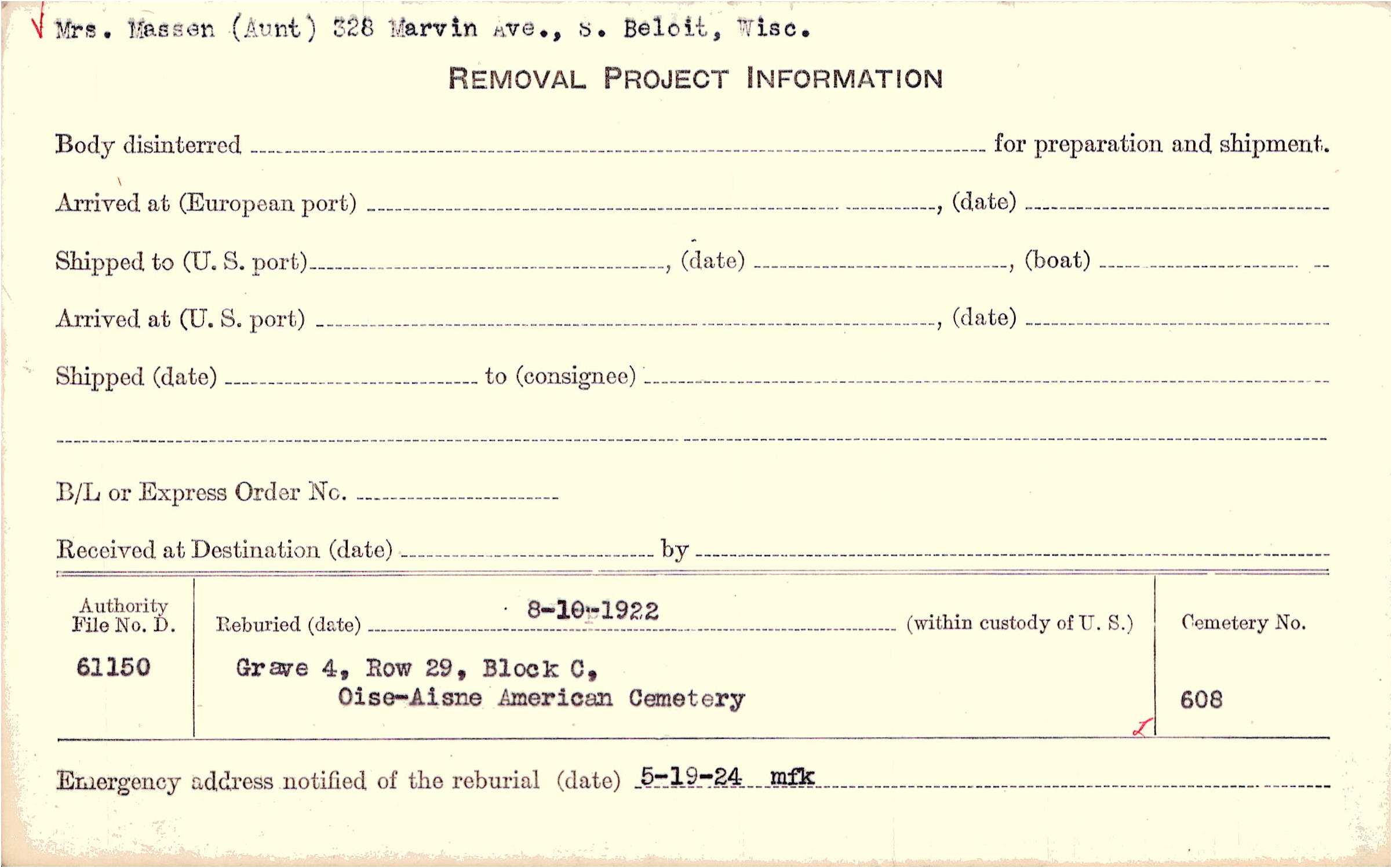 Mrs. Massen (Aunt) 328 Marvin Ave., S. Beloit, Wisc. |