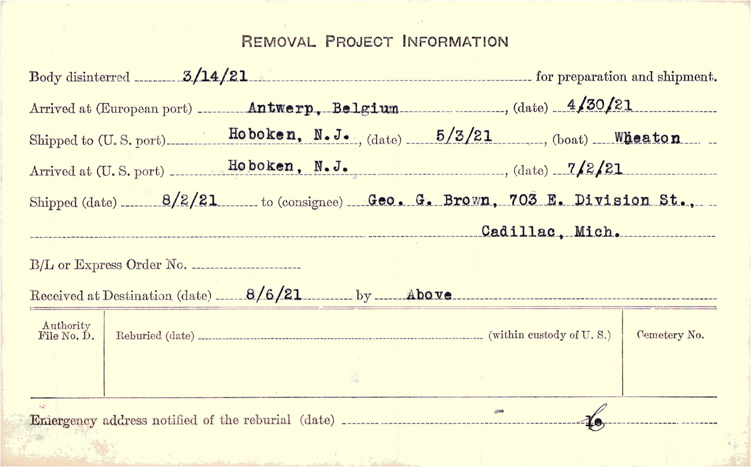 Body disinterred 3/14/1921 for preparation and shipment.