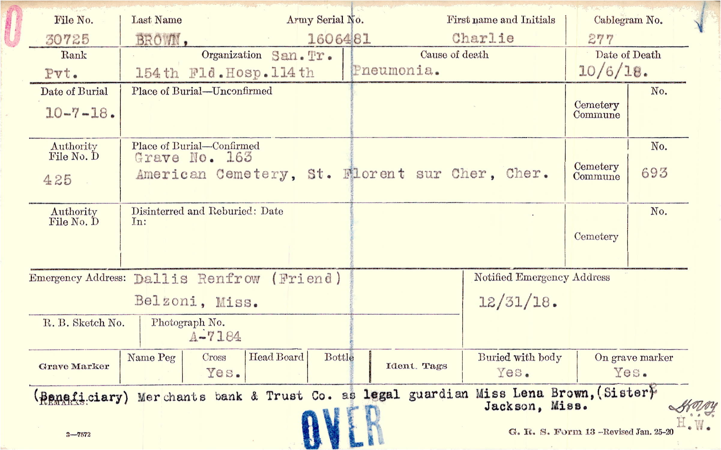 Grave 163, American Cemetery, St. Florent sur Cher, Cher.