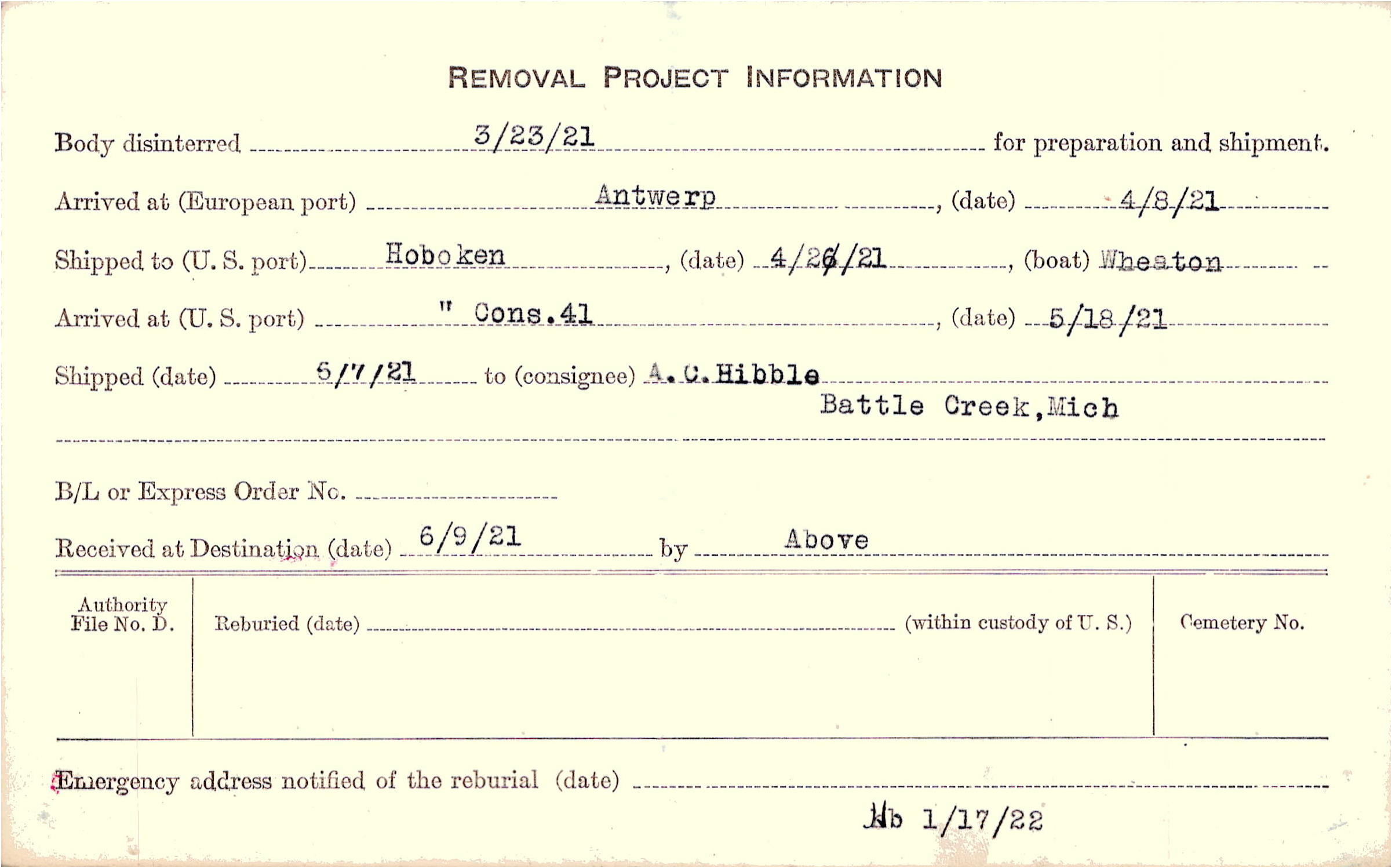 Body disinterred 3/23/1921 for preparation and shipment.