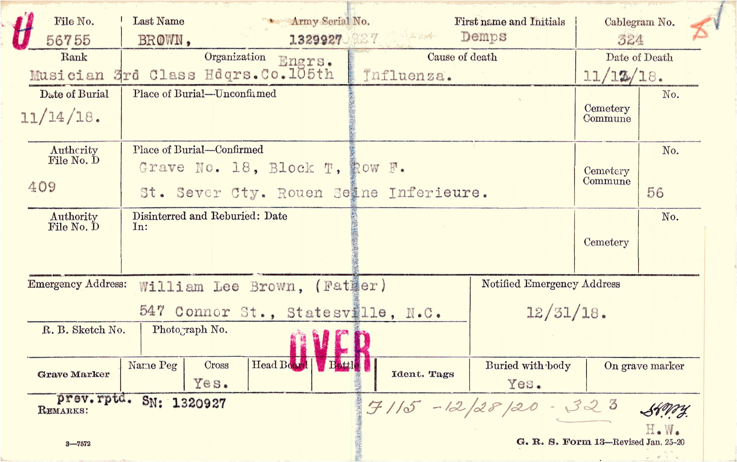 Grave 18, Block T, Row F., St. Sever Cty., Rouen Seine Inferieure.