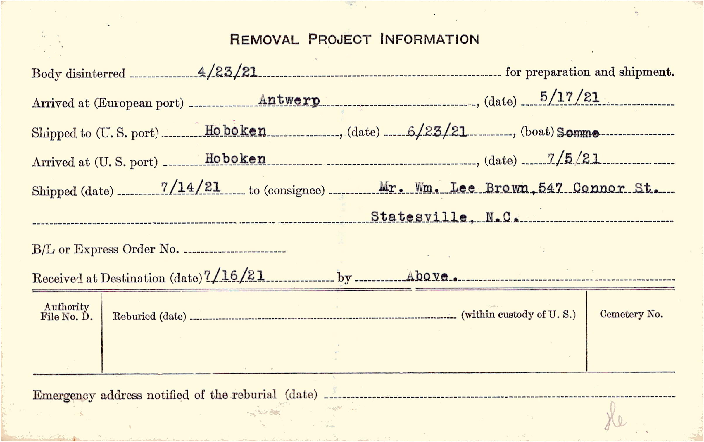 Body disinterred 4/23/1921 for preparation and shipment.