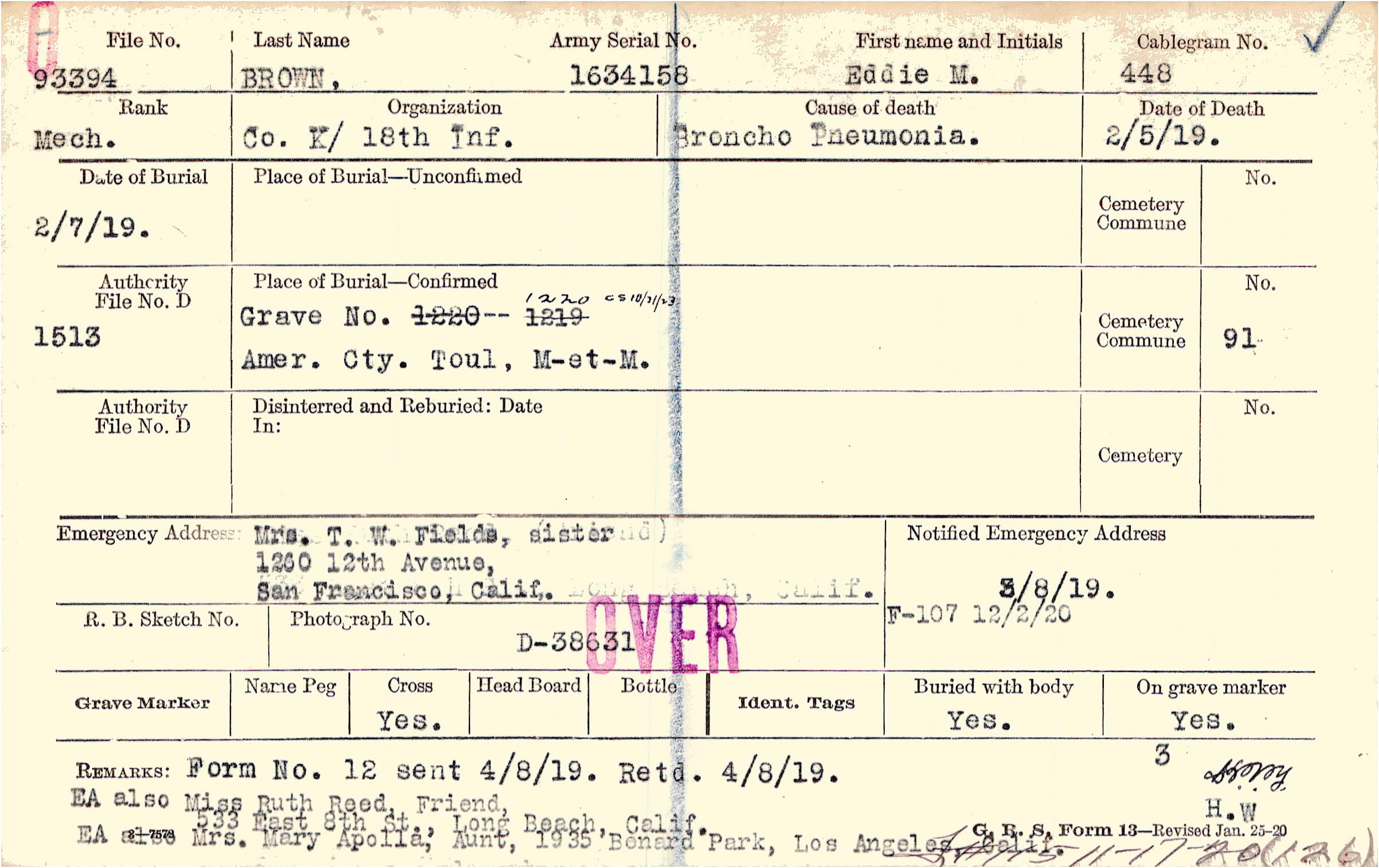 EA also Miss Ruth Reed, Friend, 533 East 8th St., Long Beach, Calif. EA also Mrs. Mary Apolla, Aunt, 1935 Bonard Park, Los Angeles, Calif., Form No. 12 sent 4/8/19. Retd. 4/8/19., F#115 11-17-20 (126)