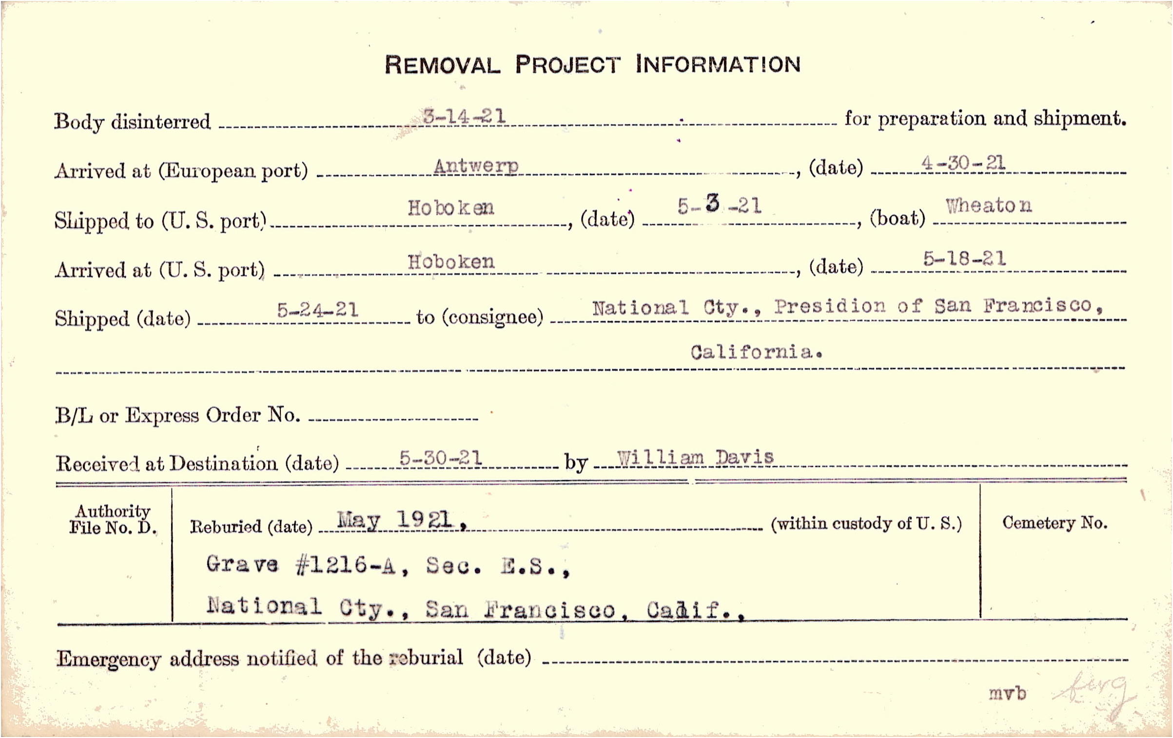 Mrs. T.W. Fields, sister, 1260 12th Avenue, San Francisco, Calif.
