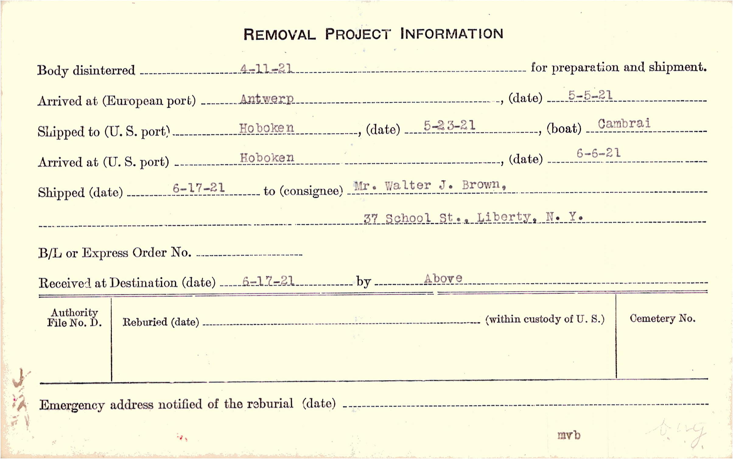 Body disinterred 4/11/1921 for preparation and shipment.