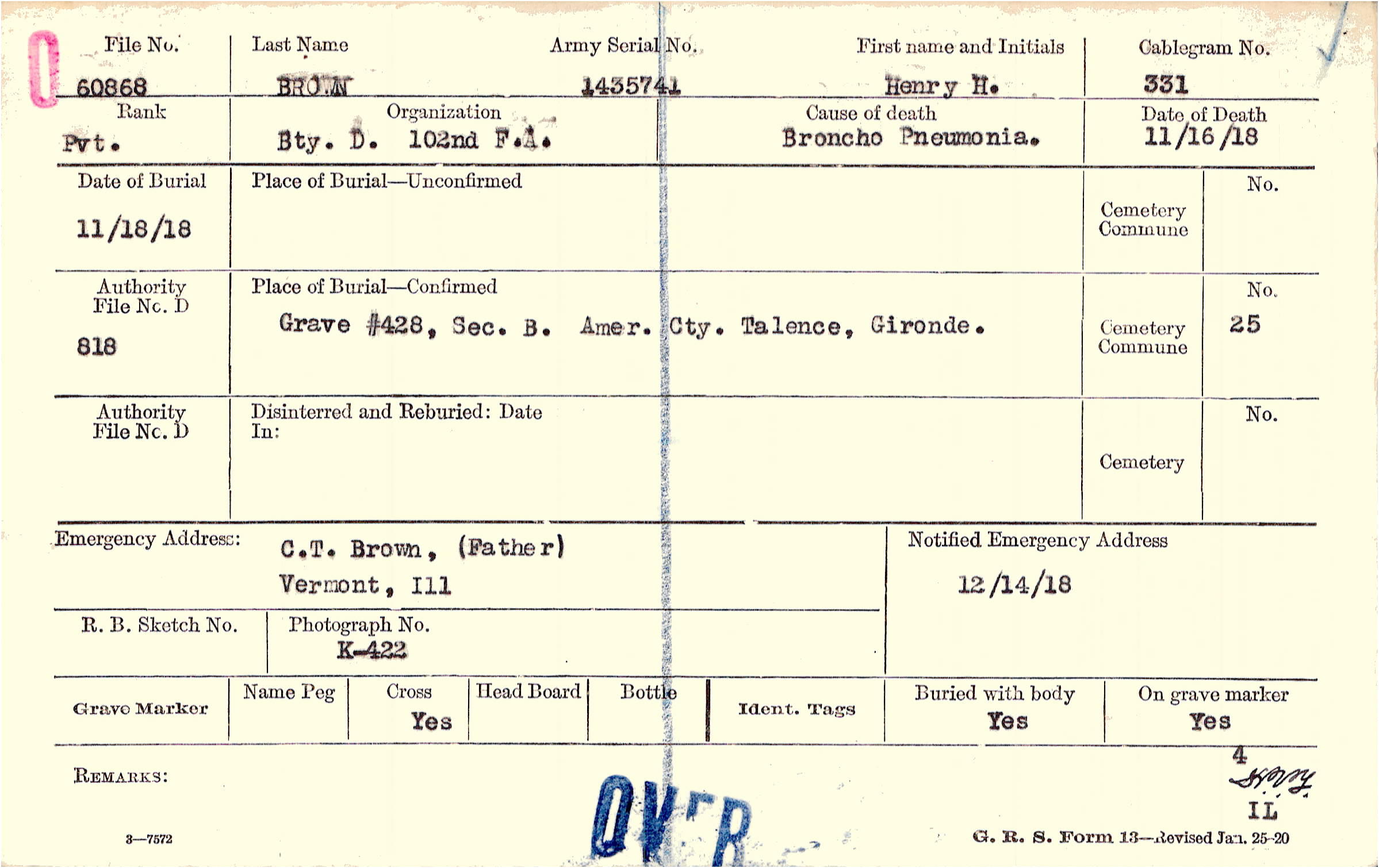Grave #428, Sec. B., Amer. Cty., Talence, Gironde.