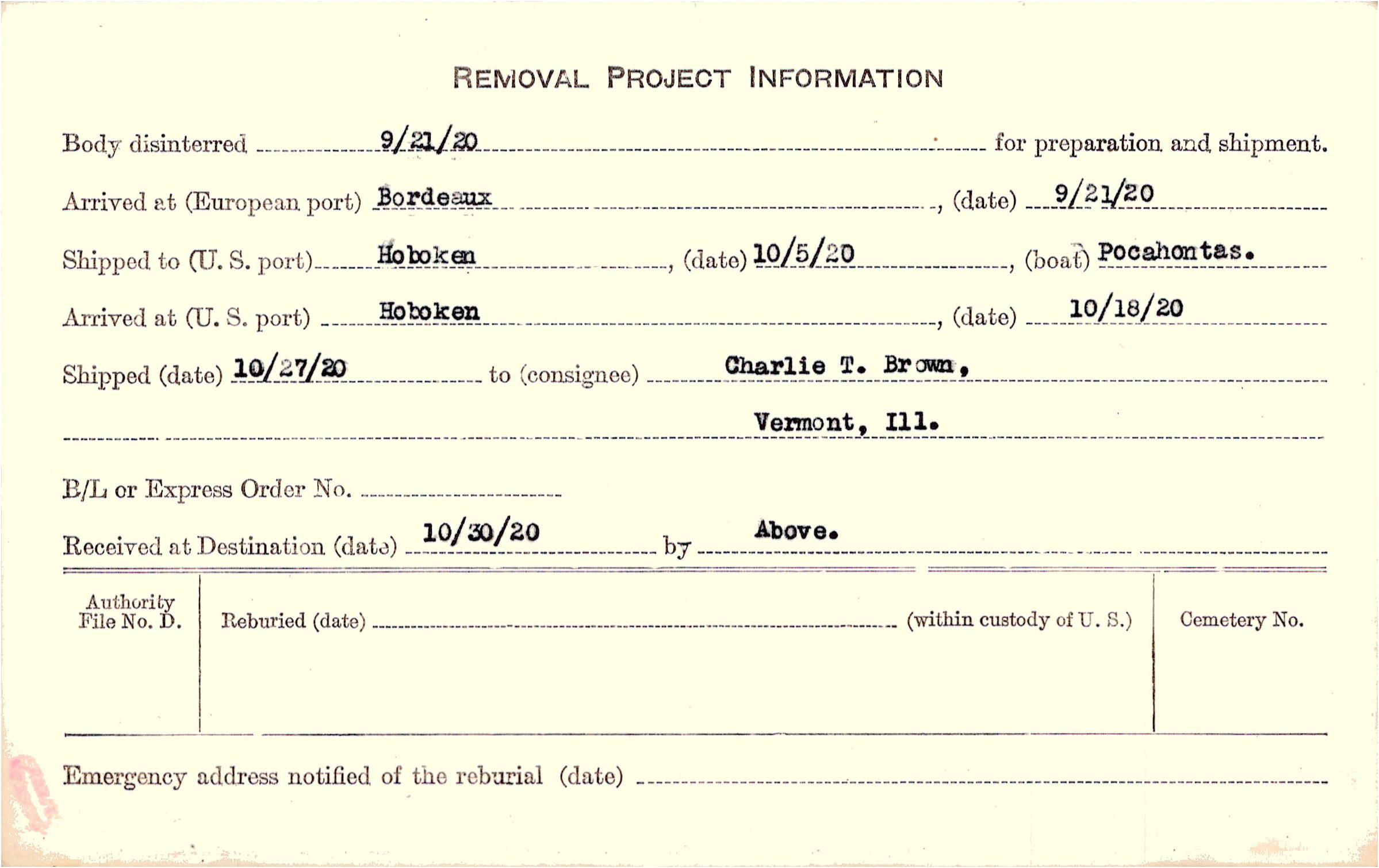 Body disinterred 9/21/1920 for preparation and shipment.