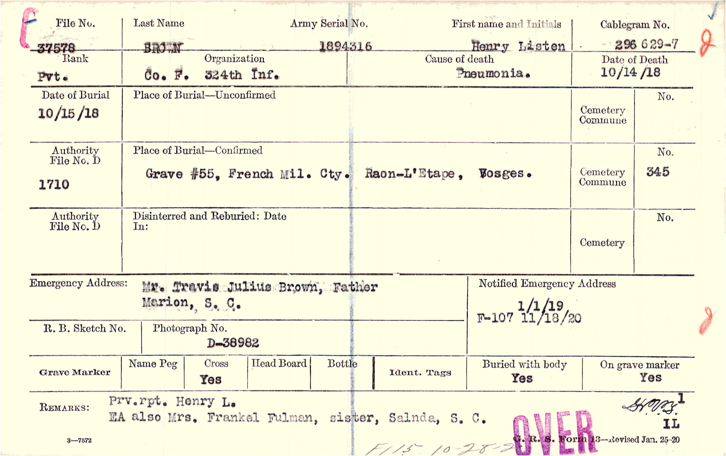 Prv. rpt. Henry L. EA also Mrs. Frankel Fulman, sister, Salnda, S. C., F115 10-28-20(?)