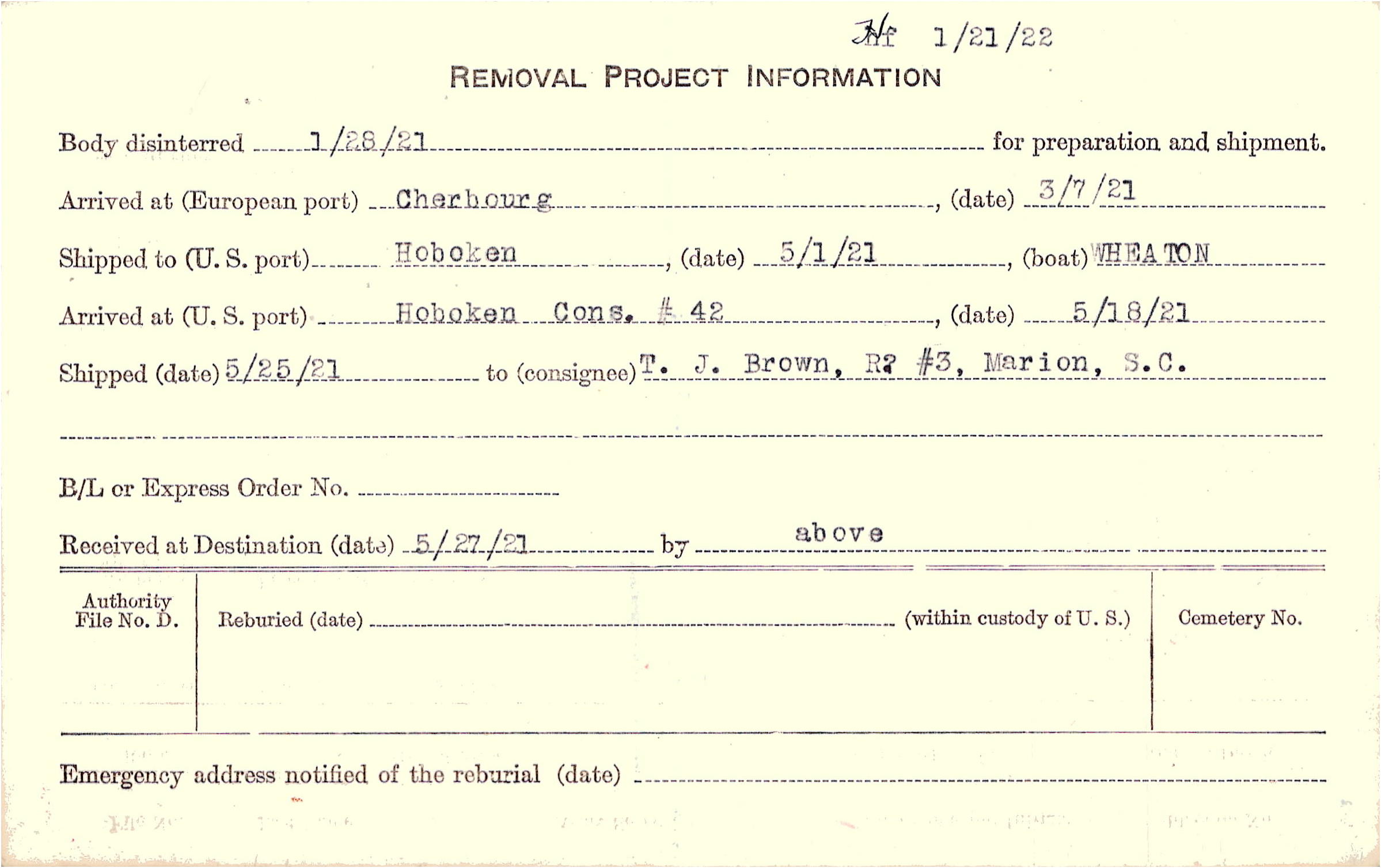Body disinterred 1/28/1921 for preparation and shipment.