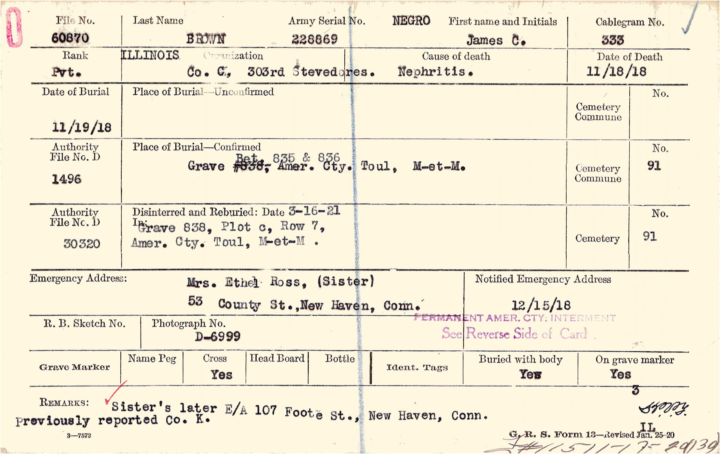 Sister's later E/A 107 Foote St., New Haven, Conn. Previously reported Co. K., F#115 11-17-20-(139)