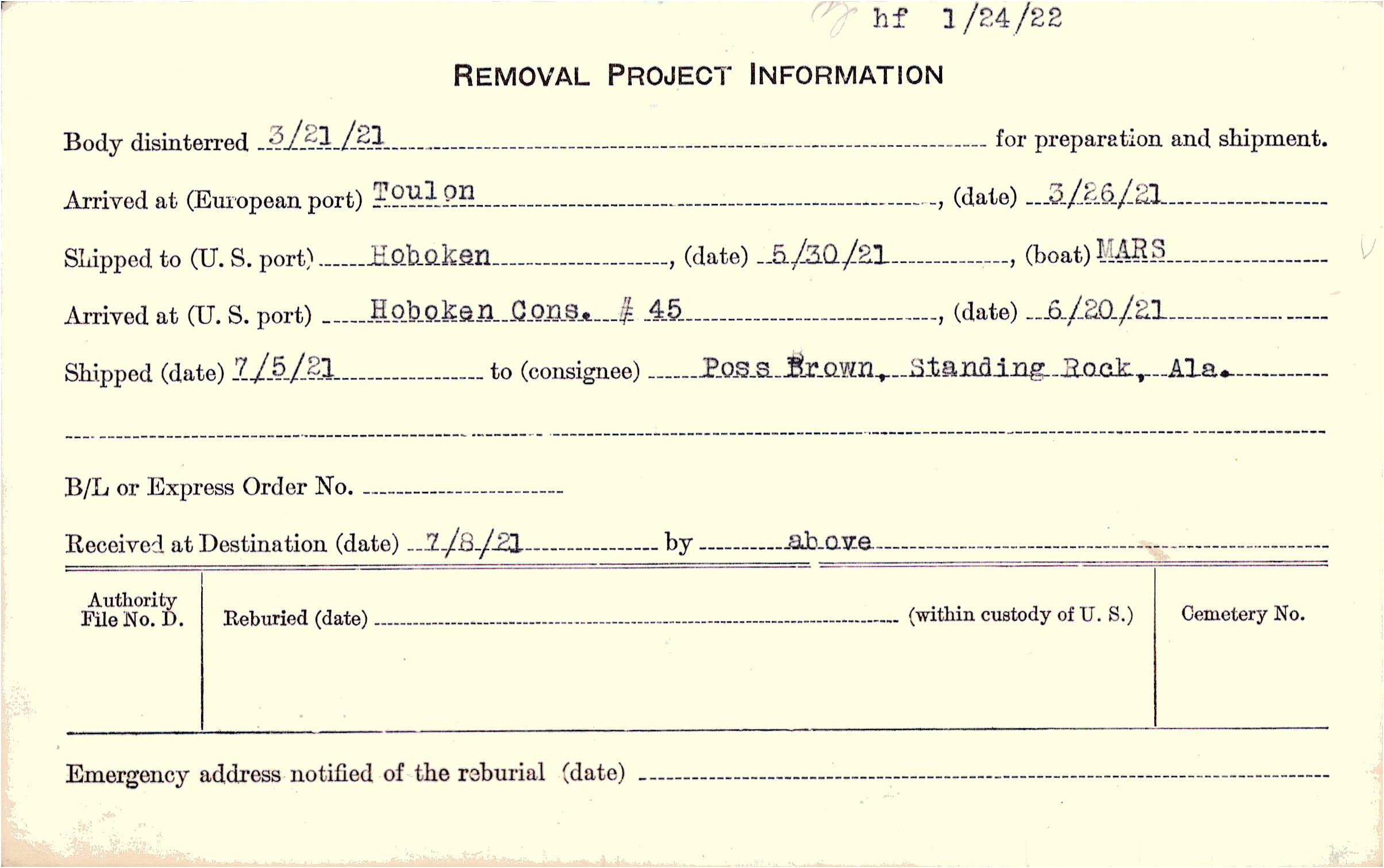 Body disinterred 3/21/1921 for preparation and shipment.