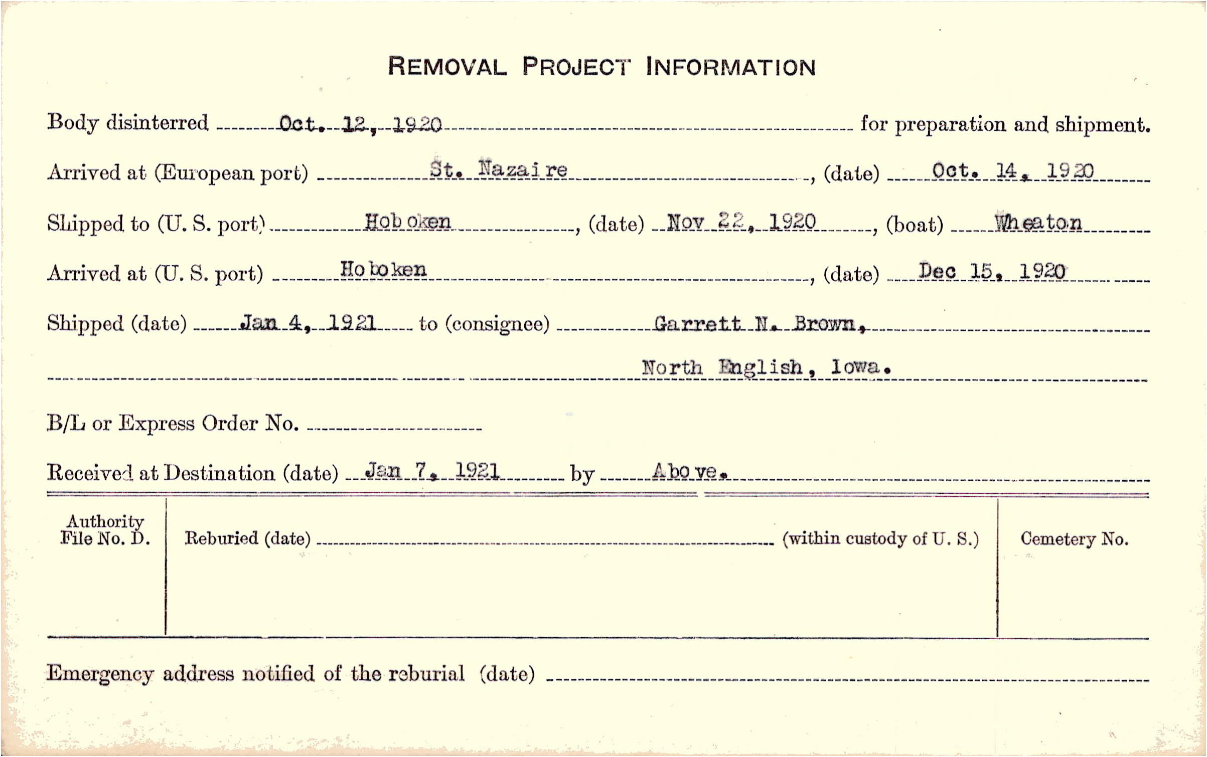 Body disinterred 10/12/1920 for preparation and shipment.